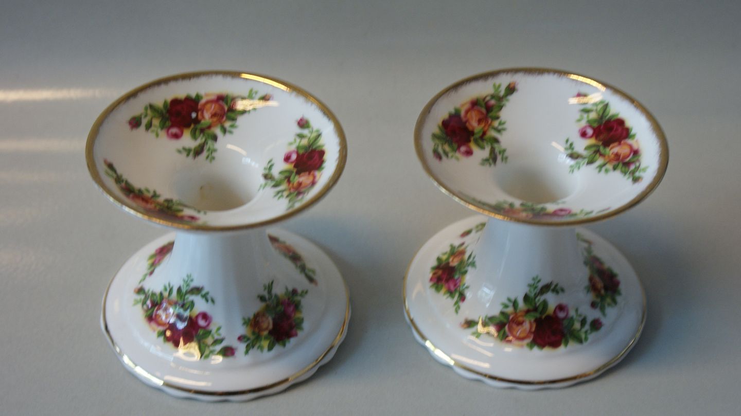 Old Country Roses Candlestick English porcelain, Royal Albert. Decorated with flowers and gold rim. Height 7 cm. Beautiful and well maintained.