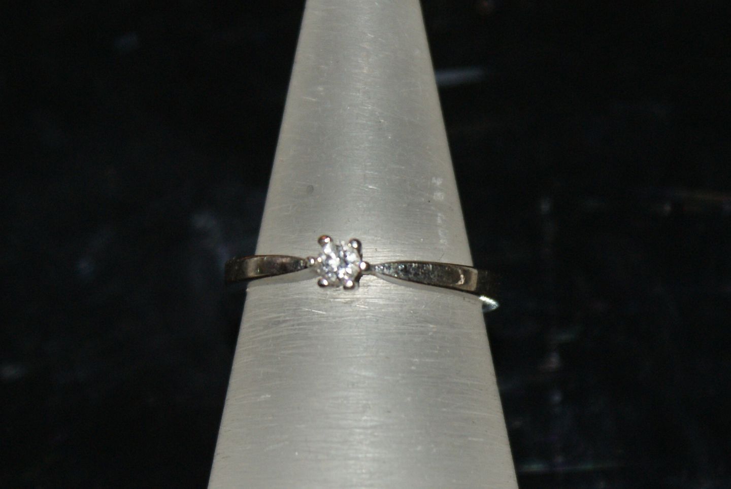 Guldring med brillant, 14 Karat Hvidguld Stemplet: 585, Bee Størrelse: 51 / 16,23 mm. Ingen eller næsten ingen brugs slidtage Varen findes ikke fysisk i forretningen Kontakt os for fremvisning