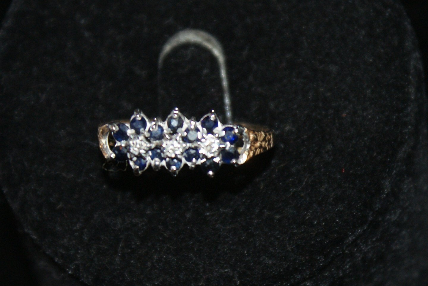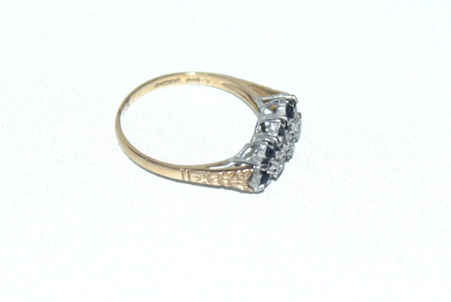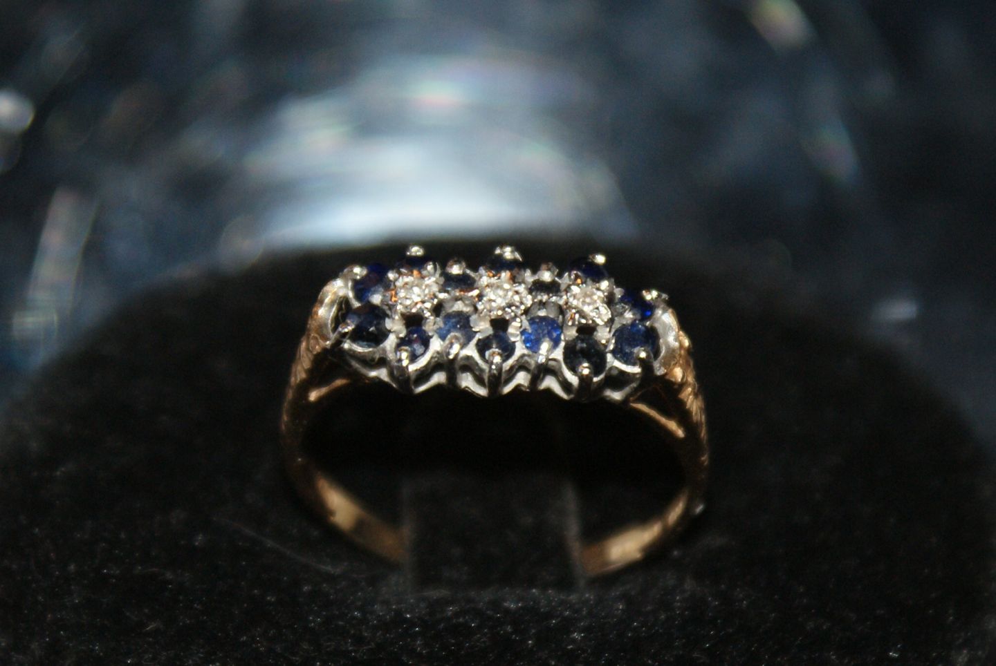 Guldring med Safir og Brillanter 9 Karat Stemplet: Engelske stempler Ringstørrelse 56 / 17,82 mm. Velholdt stand Varen findes ikke fysisk i forretningen Kontakt os for fremvisning