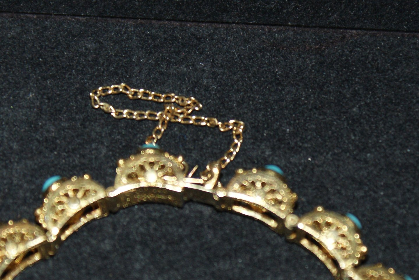 Bracelet with Turquoise, Gold 14 karat Stamped: 585, 14K, Length 17.5 cm. Width 7 mm. Thickness 6.7 mm. The jewel checked by jeweler The item is not physically in the store. Contact us for presentation