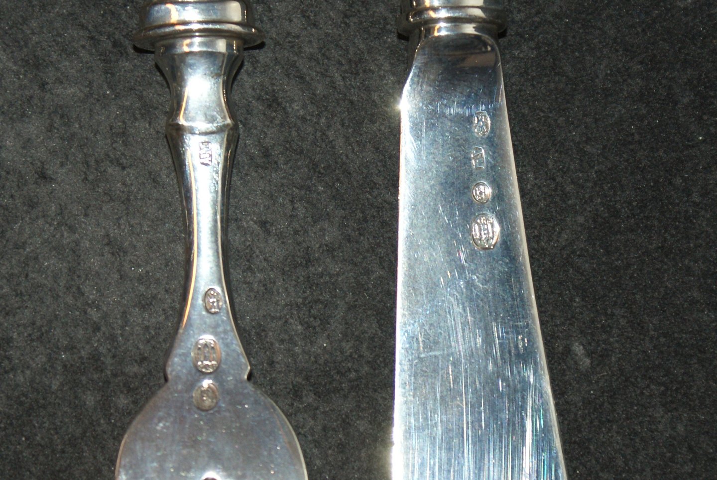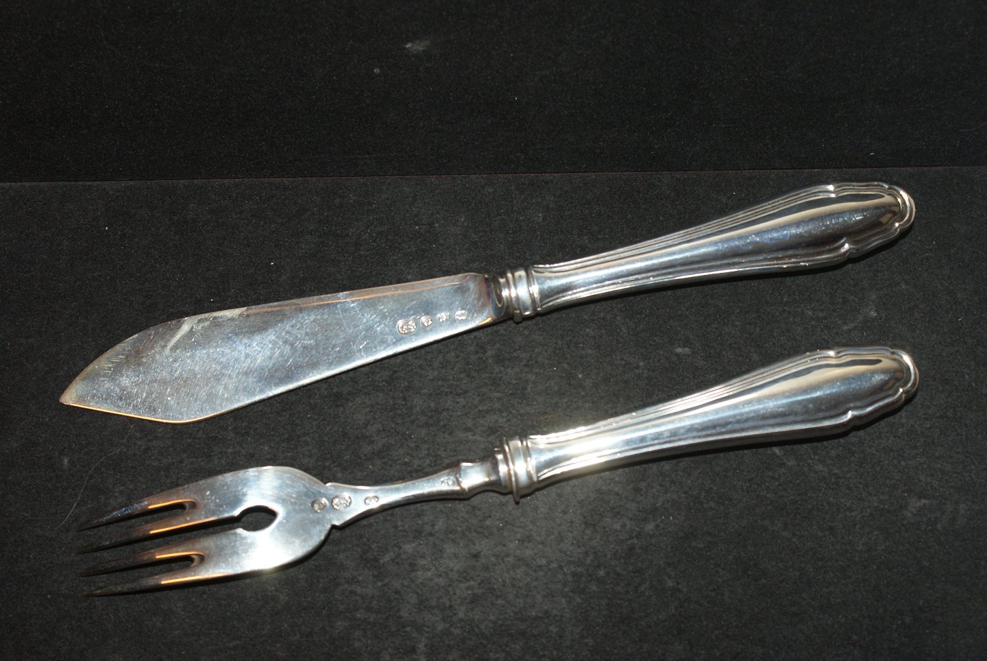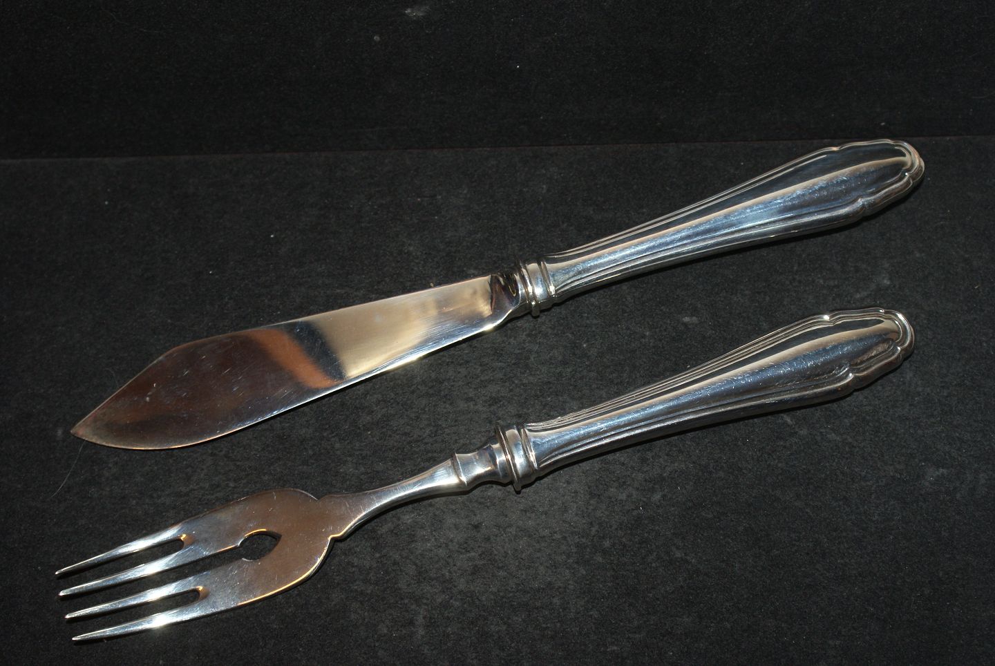 Fish cutlery set A.Michelsen 1920 Silver A. Michelsen Stamp: Three towers "20", AM, Crown over M 1 piece Knife 20,2 cm. 1 piece Fork 19.2 cm. Beautiful and well maintained, as well as polished