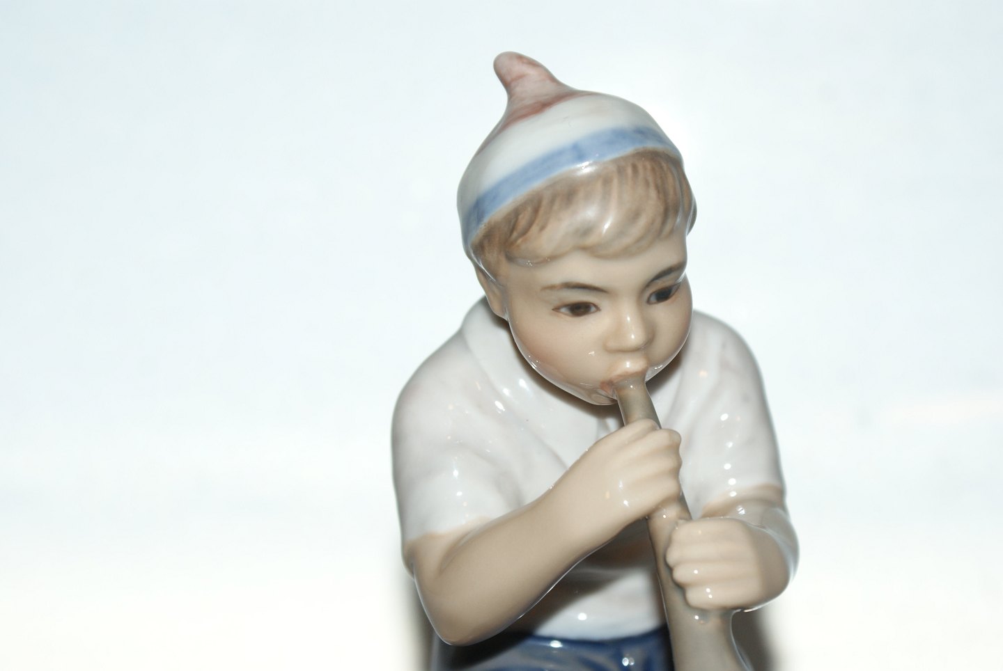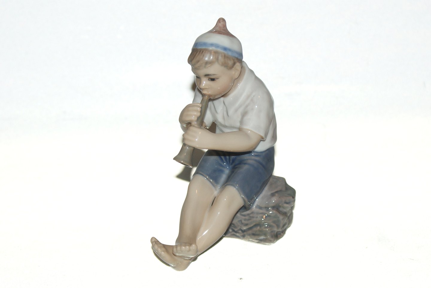 Dahl Jensen figure, boy with trumpet. The factory mark shows that this was produced between 1928 and 1985. Decoration number 1218. 1st sorting. Height 15.0 cm., Length 11.5 cm. Perfect condition without fault.