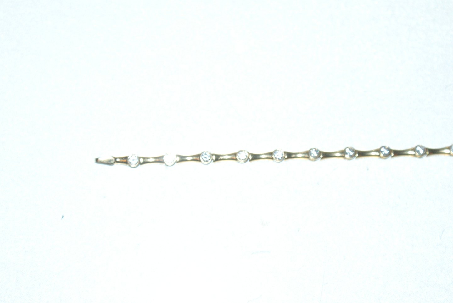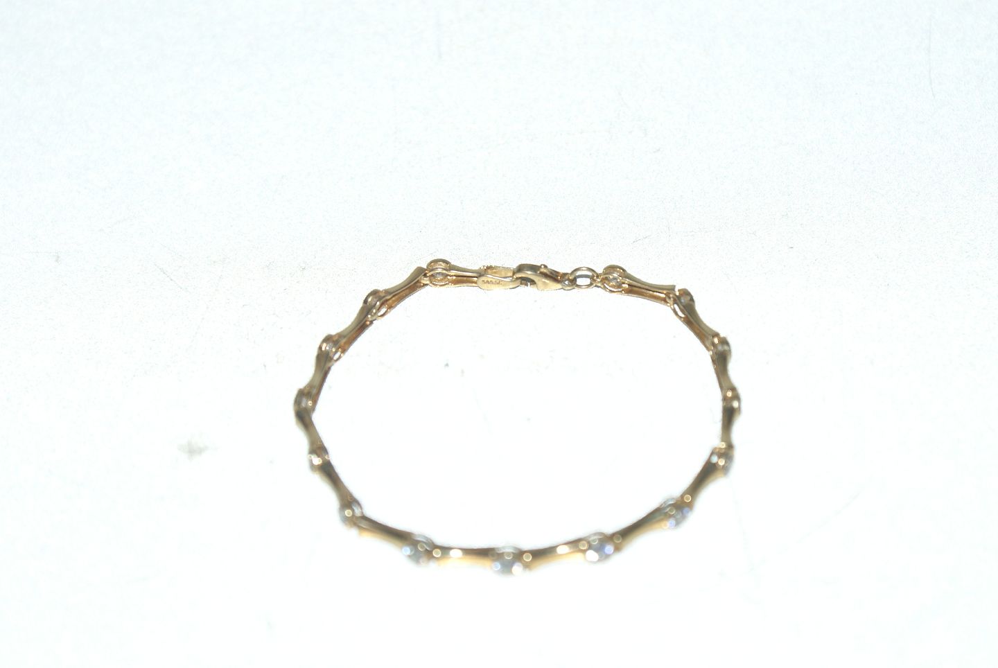 Guld Armbånd med zikoner 14 Karat Stempel: 585, Længde 16,5 cm. Bredde 3,5 mm . Flot og velholdt stand. Varen findes ikke fysisk i butikken http://www.antik-huset.dk/catalogsearch/result/?q=5273