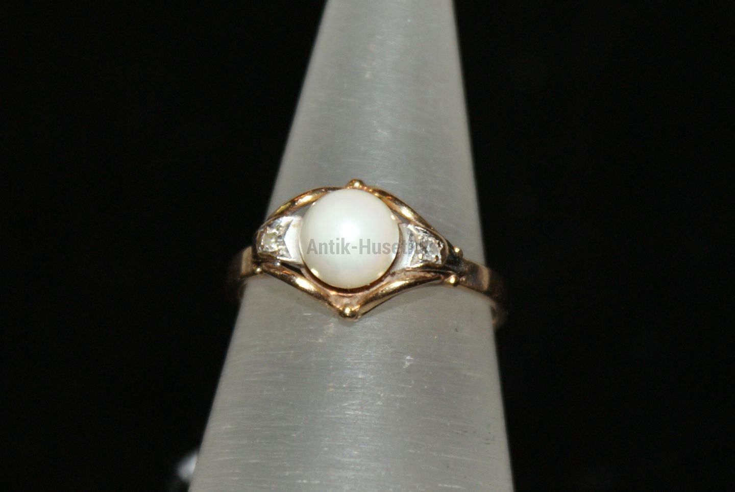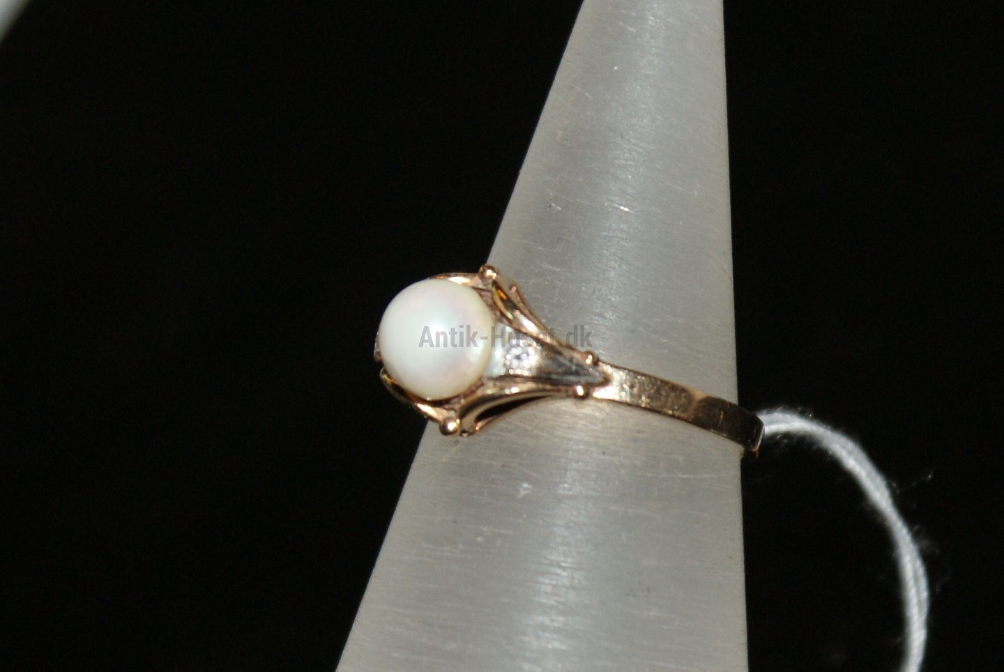 Guldring med Perle og Brillanter 14 karat. Stemplet: KJa 585. Størrelse: 51, -16,23 mm. Flot og Velholdt. Ringen findes ikke fysisk i vores butik, men kontakt os gerne for en fremvisning.
