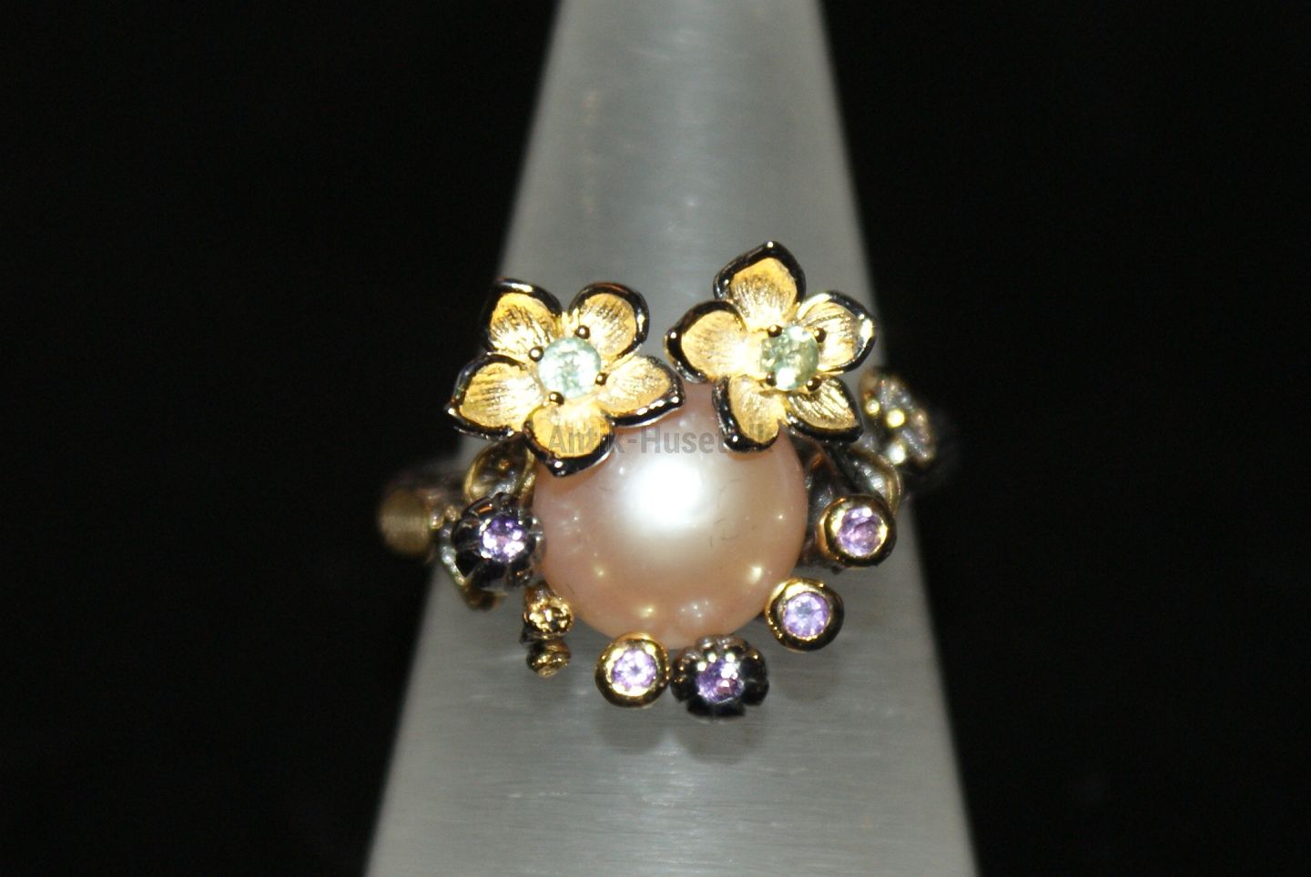 Designers Favorites ring, 216 Sterling silver, Black Rhodium 18K gold plated 2 x Peridot, RD 2.25AAA Pink Freshwater Pearl, Button shape RD 10 5 x Amethyst, RD 1.75 Size Uni size 54, 56, 58 Perfect condition
