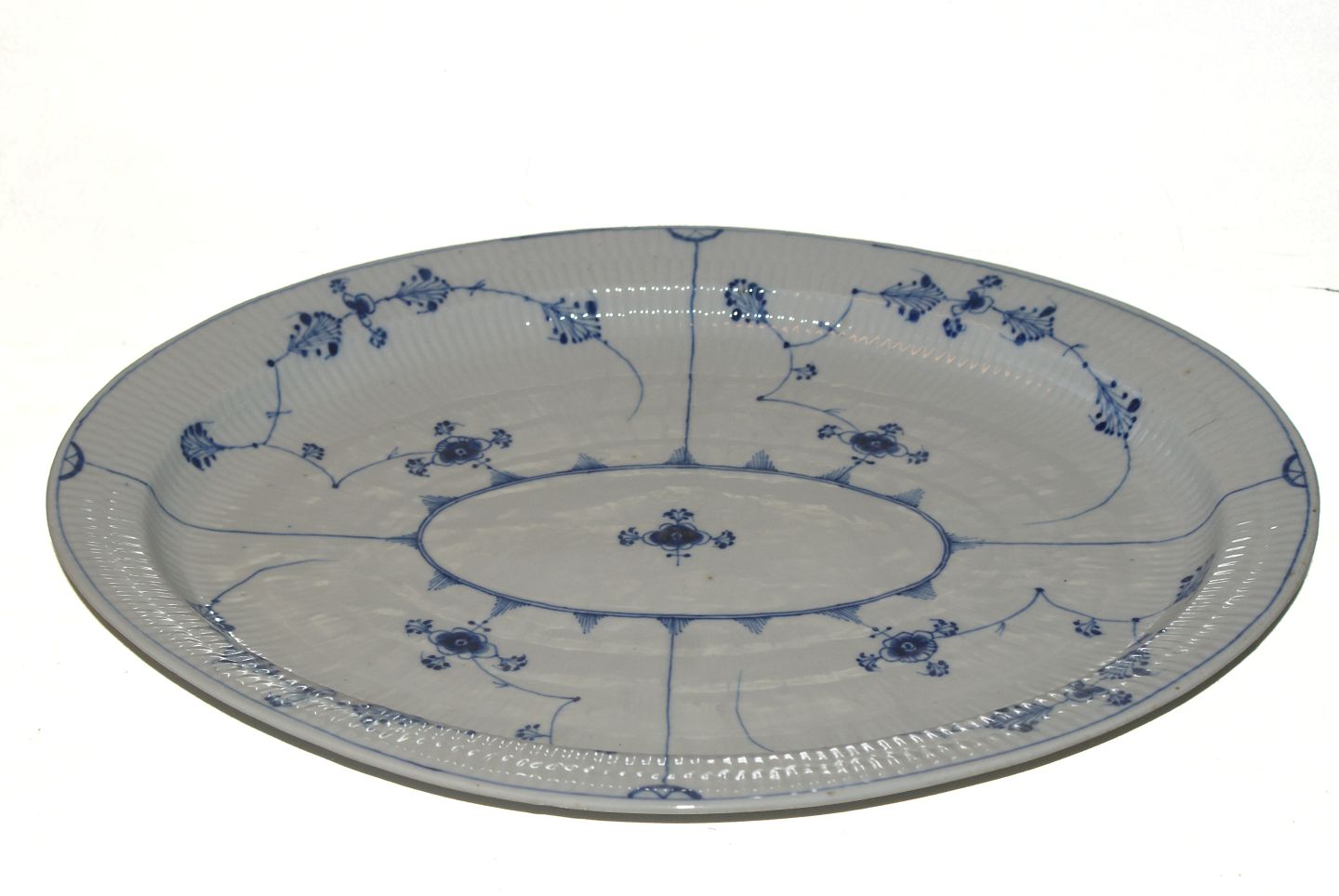 Kongelig Musselmalet Riflet, Mega stort bredovalt Fad, fra 1880-90 Har en lille brændningsfejl Dek. nr. 1/102 Længde 47 cm. Bredde 37 cm.