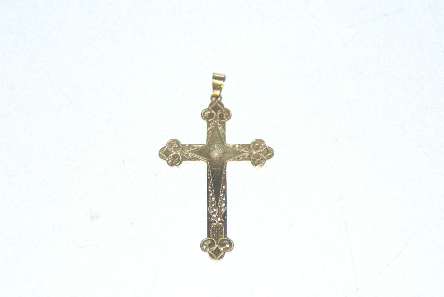 Elegant Kors med Perle 14 karat Højde 57,31 mm Brede 31,13 mm mm Tykkelse 1,41 mm Pæn og velholdt stand Varen findes ikke fysisk i vorees butik så kontakt os for yderligere info