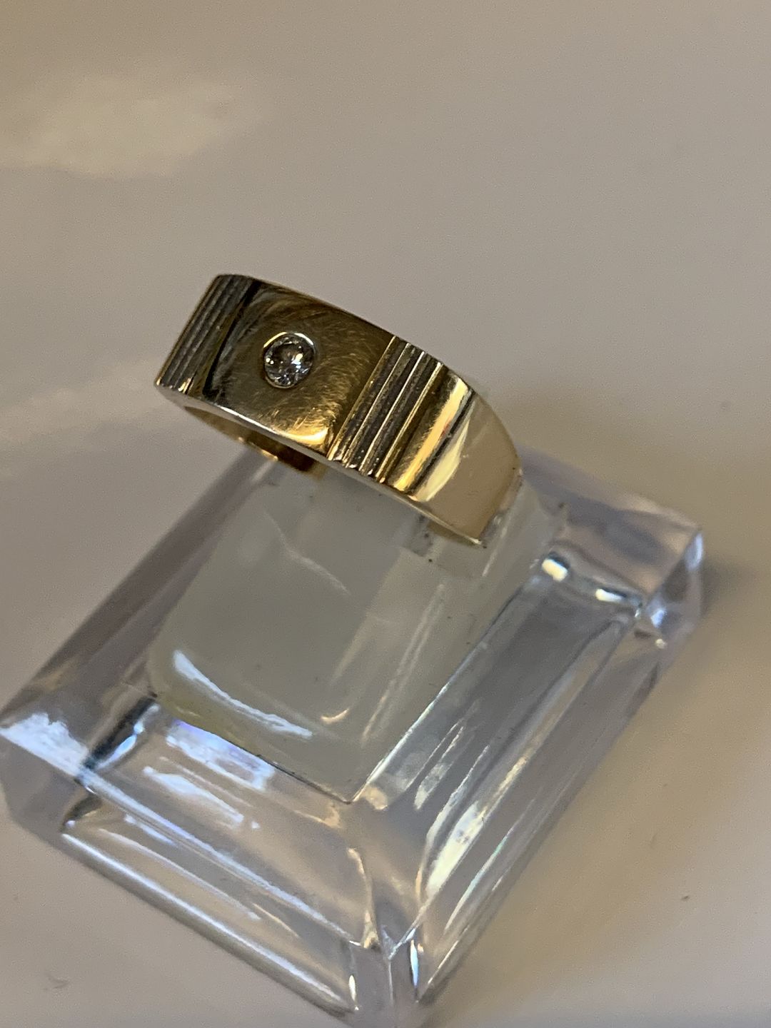 Signetring med en diamant i 14 karat guld. Stemplet KH 585. Størrelse 57. Pæn og velholdt stand. Tjekket af guldsmed, Smykket findes ikke fysisk i butikken, men kan fremvises efter ønske. Kontakt os gerne for en fremvisning