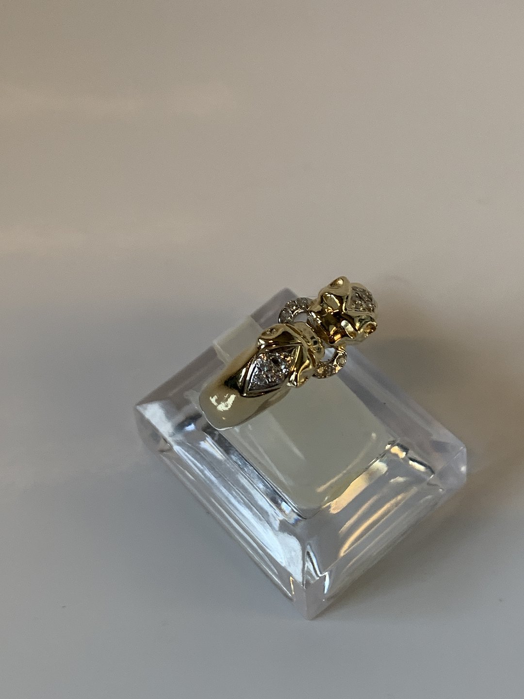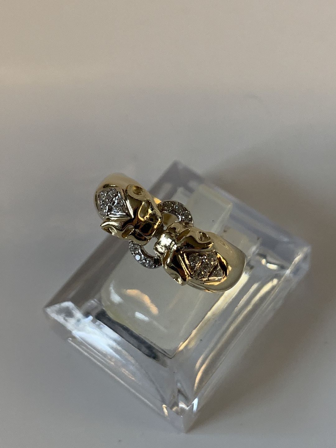 Damering i 14 karat Guld i form af 2 leoparter, med indlagte sten Stemplet 585 Størrelse 63 Pæn og velholdt stand Varen er tjekket af guldsmed, og findes ikke fysisk i vores butik så kontakt os for fremvisning eller yderligere info