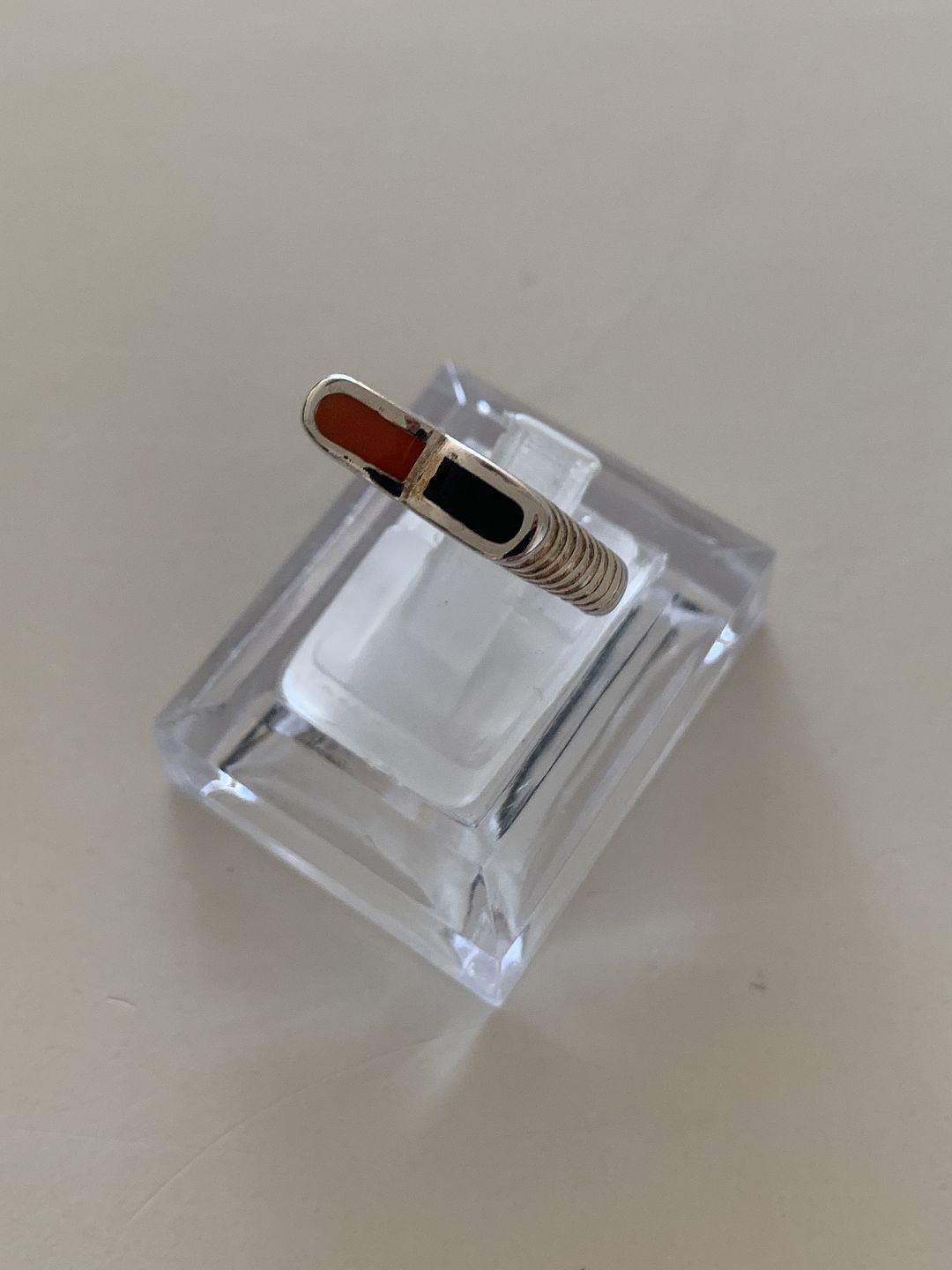 Open silver ring Stamped 835 Insert unknown orange / black material The ring can be adjusted from size 54 to 56
