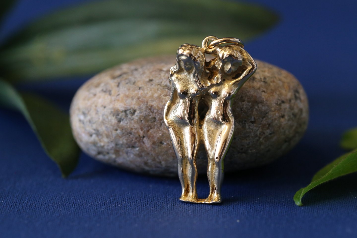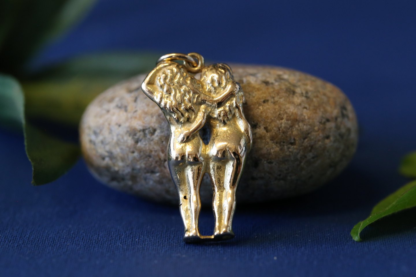 Smukt og detaljeret vedhæng i 14 karat 585 massivt guld, tvillinger. Kan bruges enten alene til halskæde, eller som charm i armbånd. Det er smedet med mange detaljer, så det fremstår elegant og stilet.