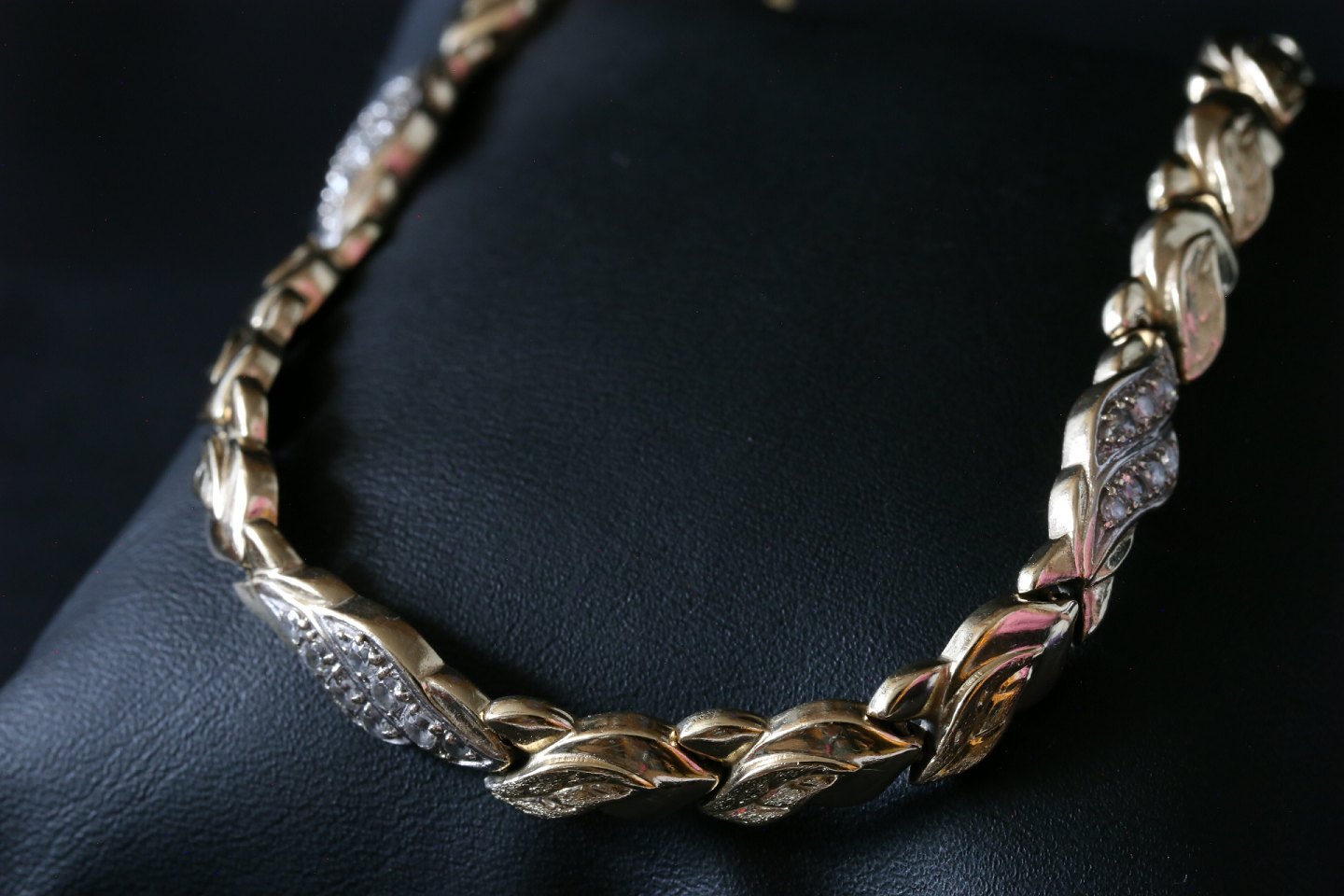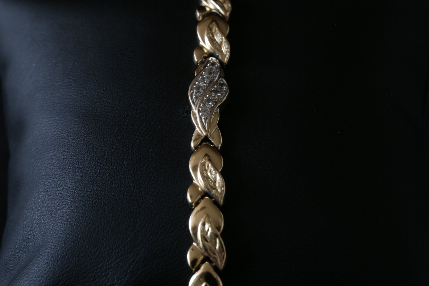 This gold bracelet is beautiful and elegant. 14 carat 585 gold. It is forged with detailed joints, and beautiful inlaid stones. The bracelet is stylish and fits a beautiful dress.