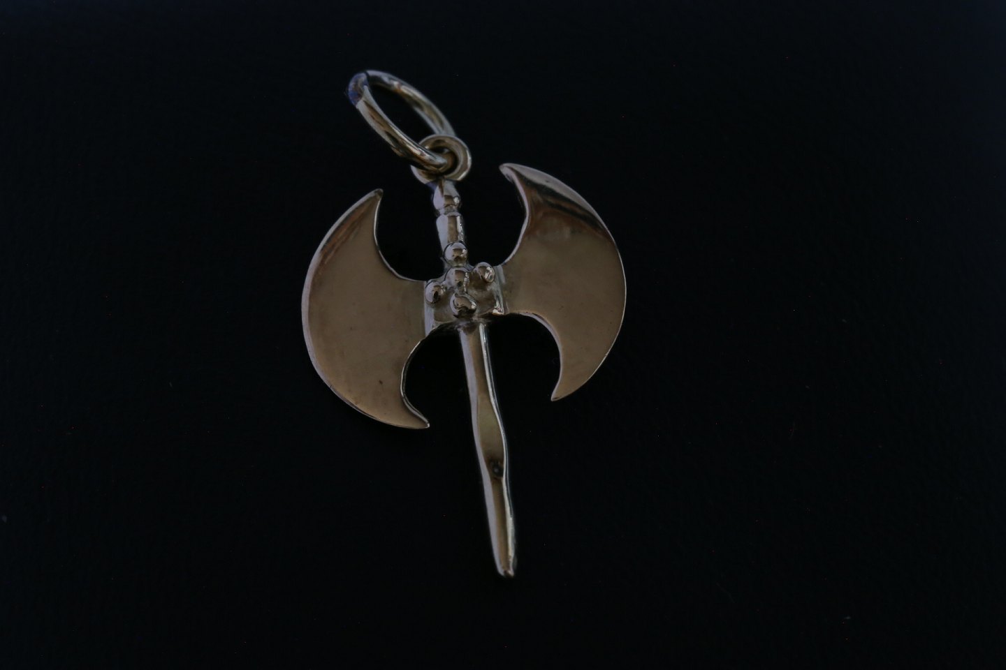 Beautiful and simple motif, shaped like a battle ax and forged in 14 carat gold. A nice and masculine pendant that will look good in a yellow chain around the neck. The jewelry is simple, but at the same time beautiful and minimalistic.