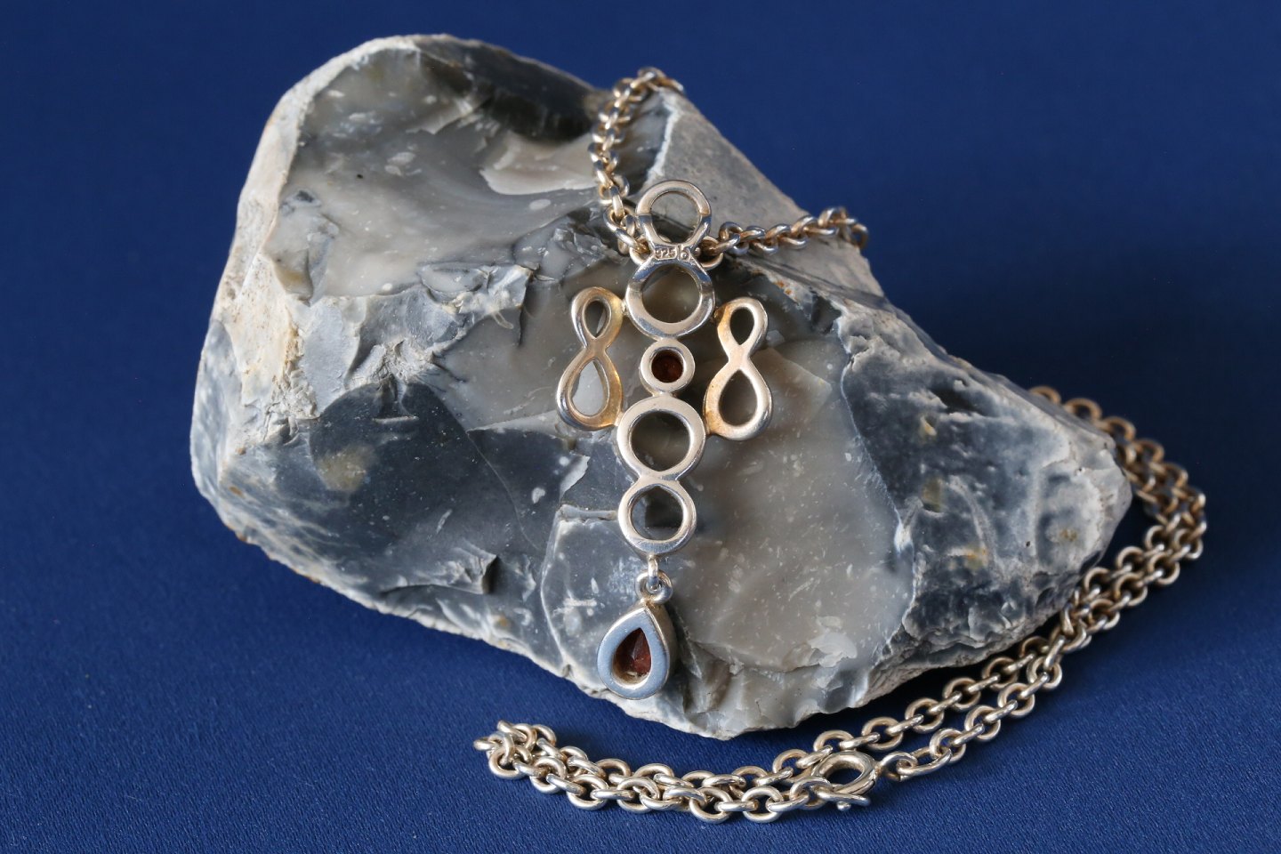 Denne flotte halskæde er udført i 925 Sterling Sølv. I halskæden hænger et flot vedhæng, der består af to led. Der er indlagte sten i vedhænget, hvilket gør det specielt flot. Denne halskæde vil passe til langt de fleste anledninger, samt beklædning.