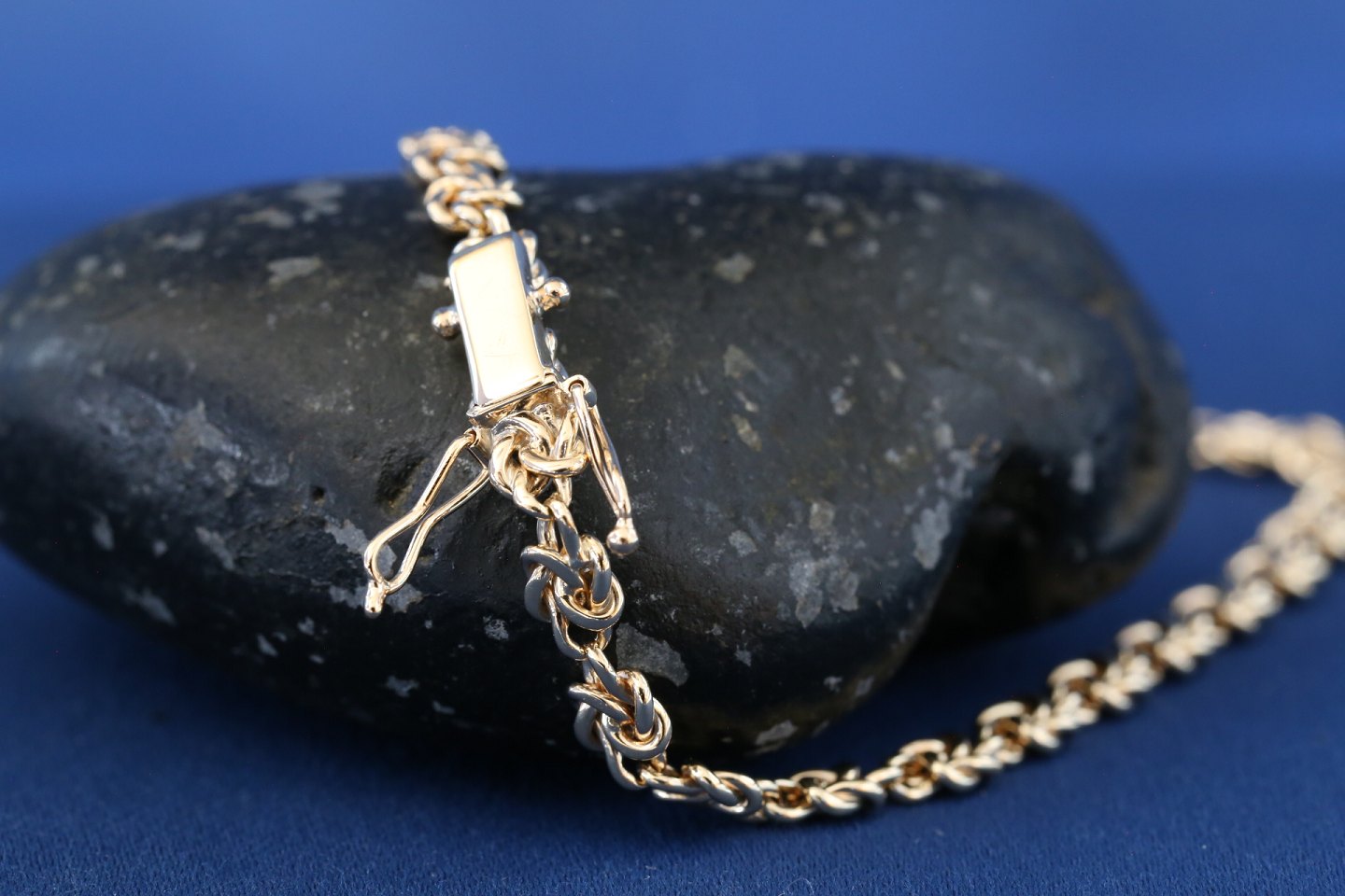 Elegant gold bracelet with links, shaped like a knot. The gold bracelet is made of 14 carat gold, and with a box lock. The bracelet is very elegant and gives the wearer a classically elegant look. There is a matching necklace that can be seen here: https://www.antikhuset.net/stort.asp?selbinr=547937&t2=547937&vissolgt=on