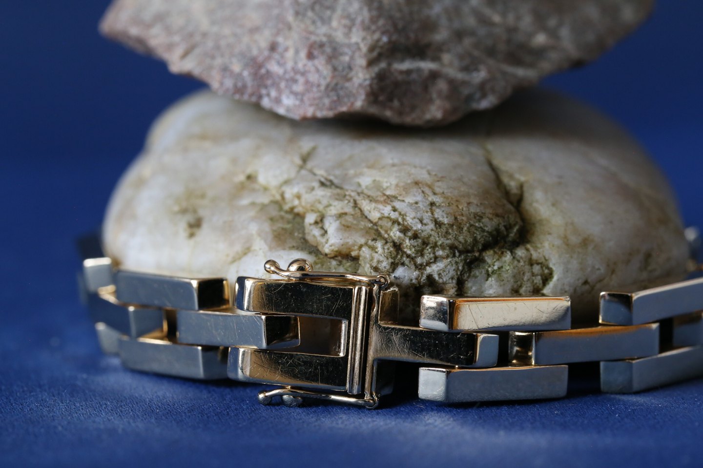 Beautiful and exclusive gold bracelet in 14 carat gold. The gold bracelet is made with 3 rows of blocks. The bracelet is made with thick links that make this bracelet an exclusive piece of arm jewellery. The lock is engraved with CHL and 585.