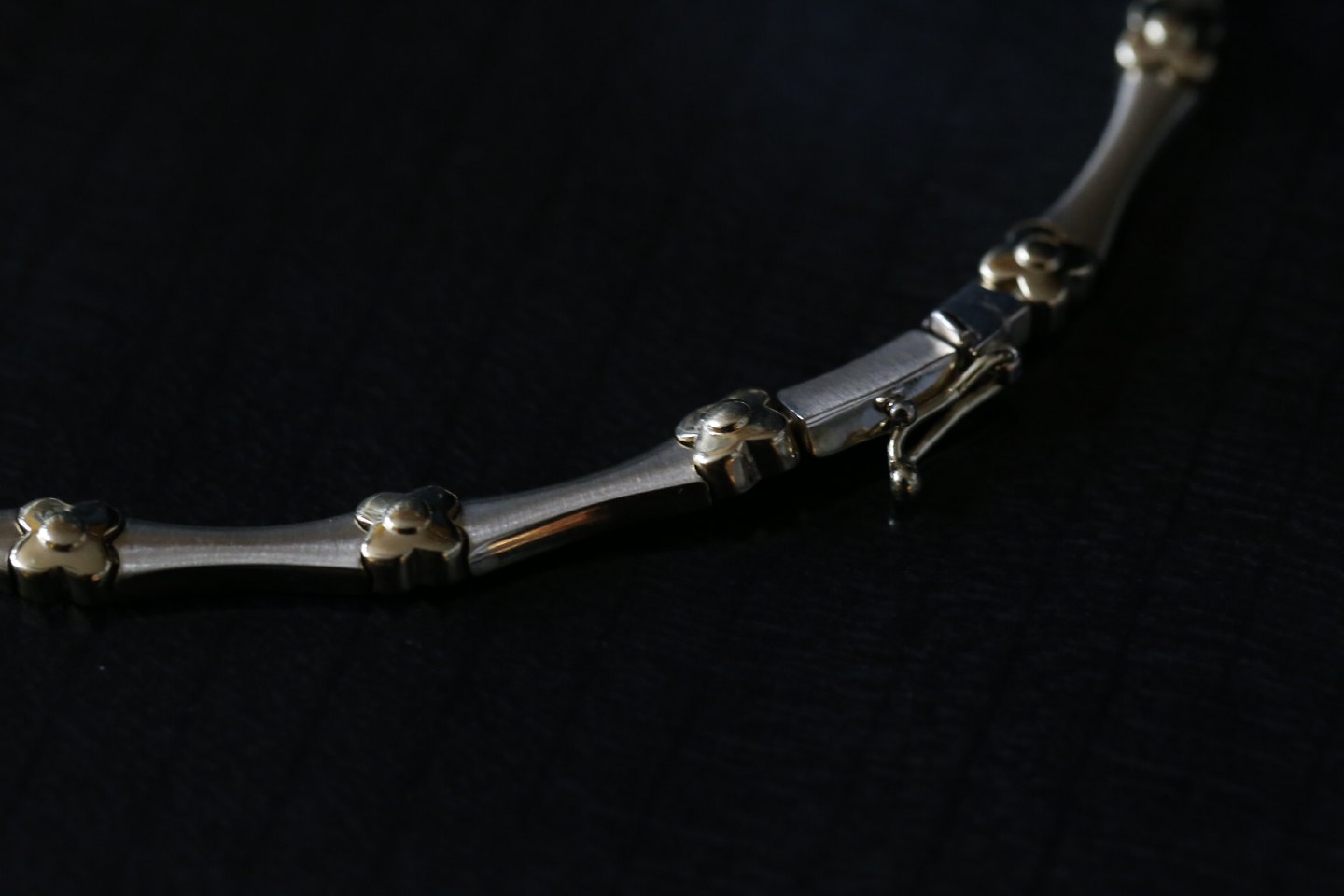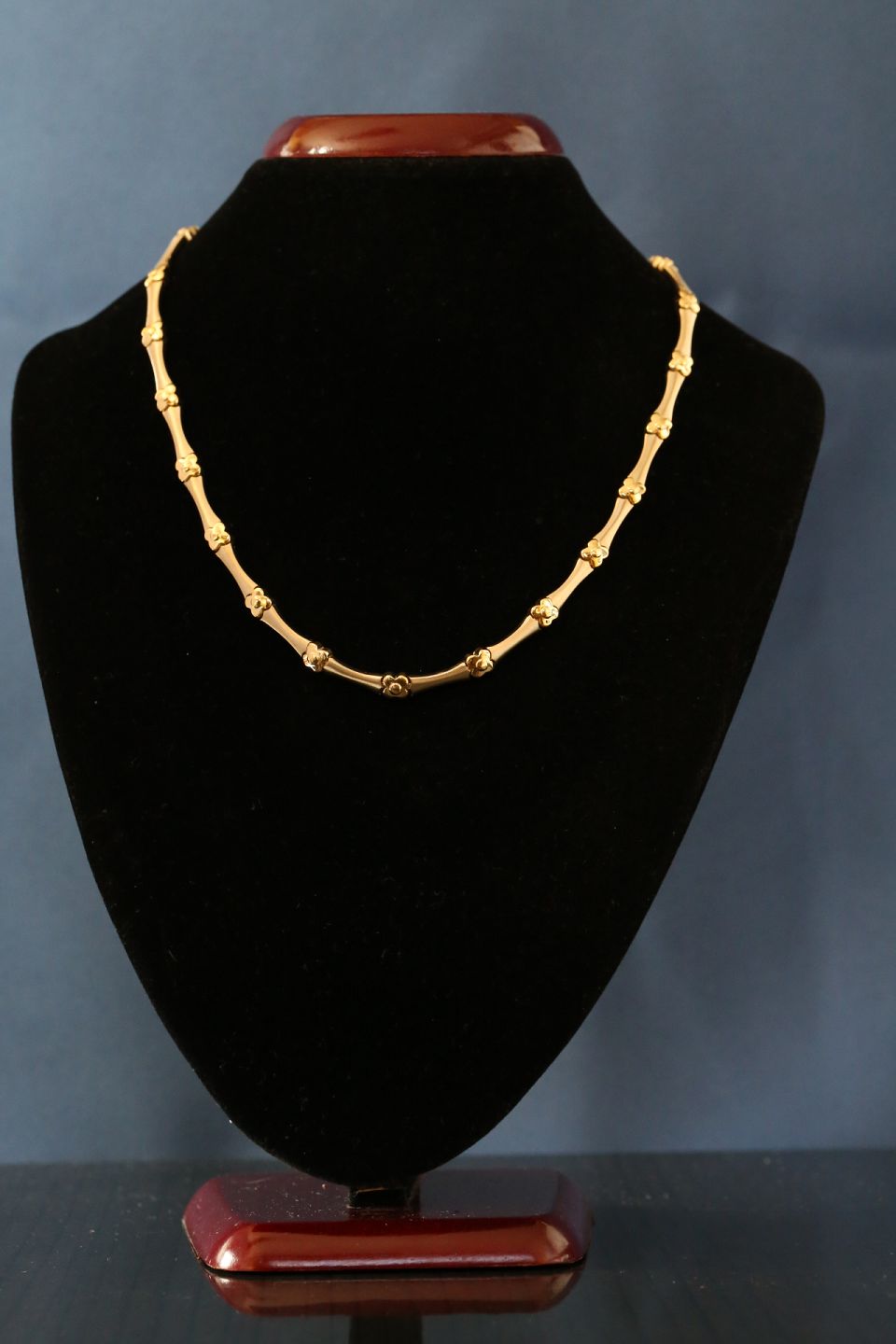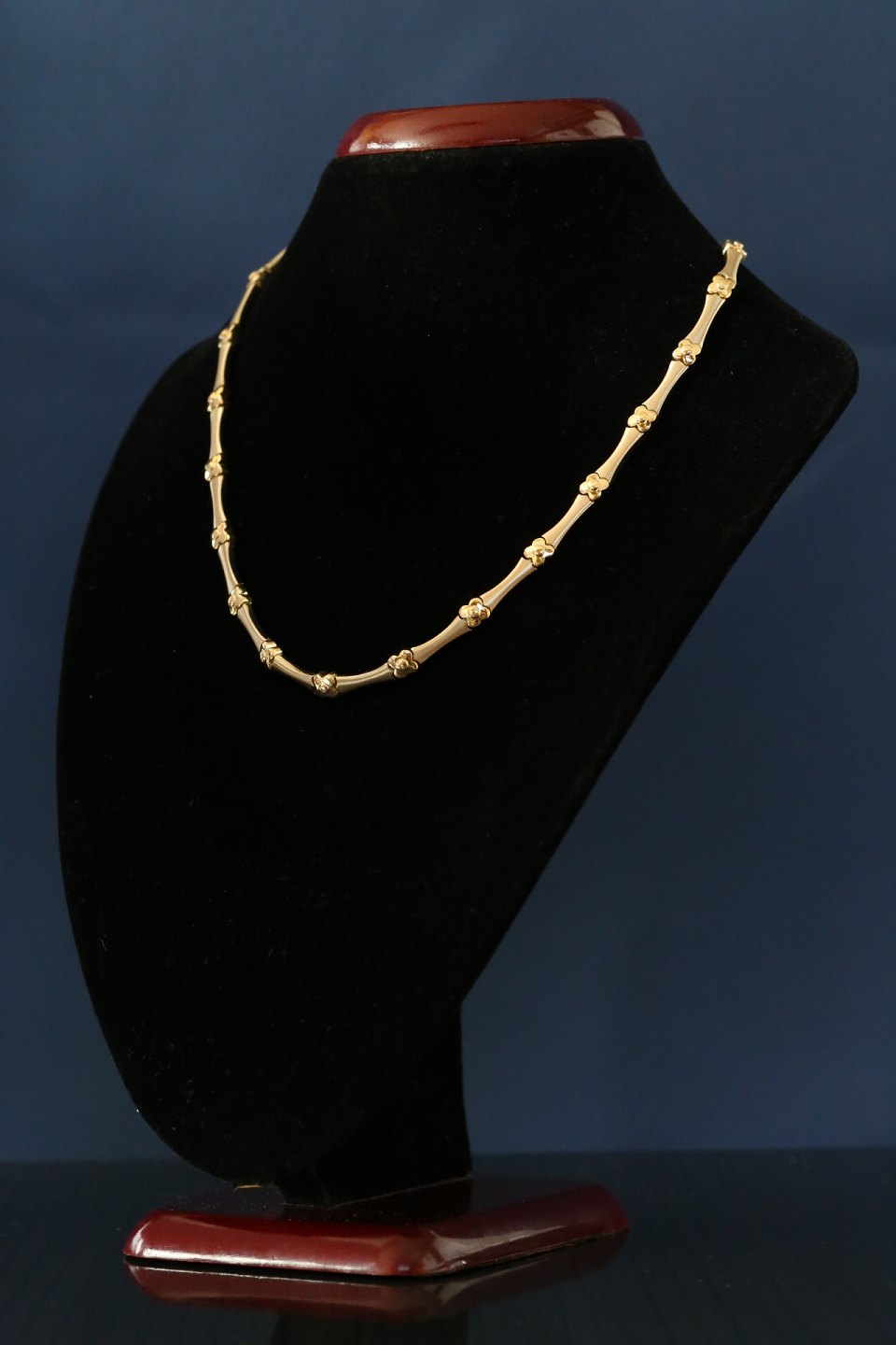 Beautiful gold chain in 14 carat solid gold. The chain is made in a single motif, where the transition between each link is made up of a beautiful flower. The chain's simple motif makes the chain elegant and easy to wear. There are matching bracelets that can be seen here: https://www.antikhuset.net/stort.asp?selbinr=547227