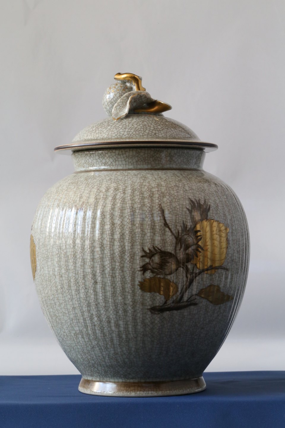 Nice lidded vase from Royal Copenhagen, with painted hazelnuts and leaves. The vase is also made with crackling, which makes the vase rustic and beautiful in its own way. The lidded vase has many beautiful details. The lid is shaped like a hazel branch, which makes it something special.