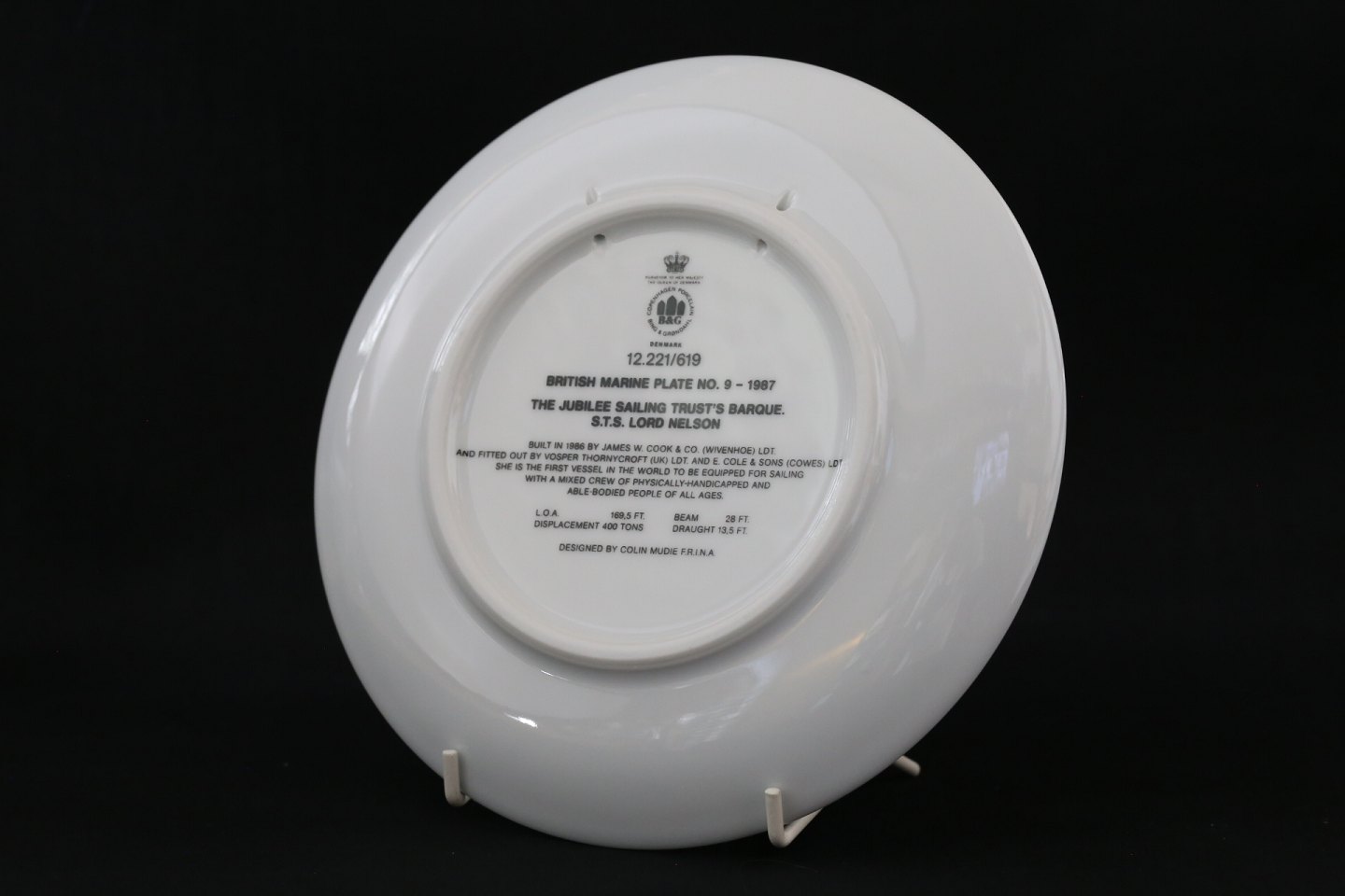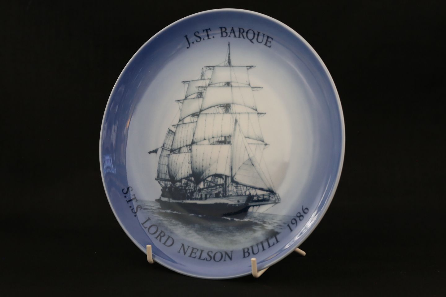 Skibsplatte Bing & Grøndal, No. 9, fra 1987. Platten er bemalet med J.S.T. Barque, med teksten S.T.S. Lord Nelson Built 1986. Der er tekst om skibet på bagsiden af platten.