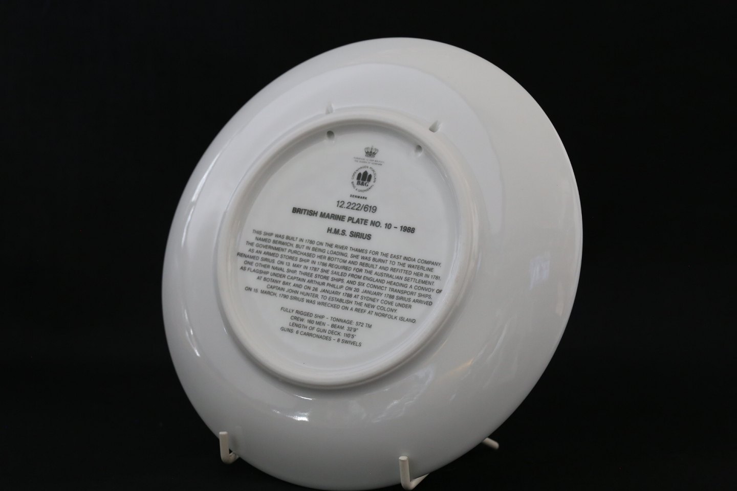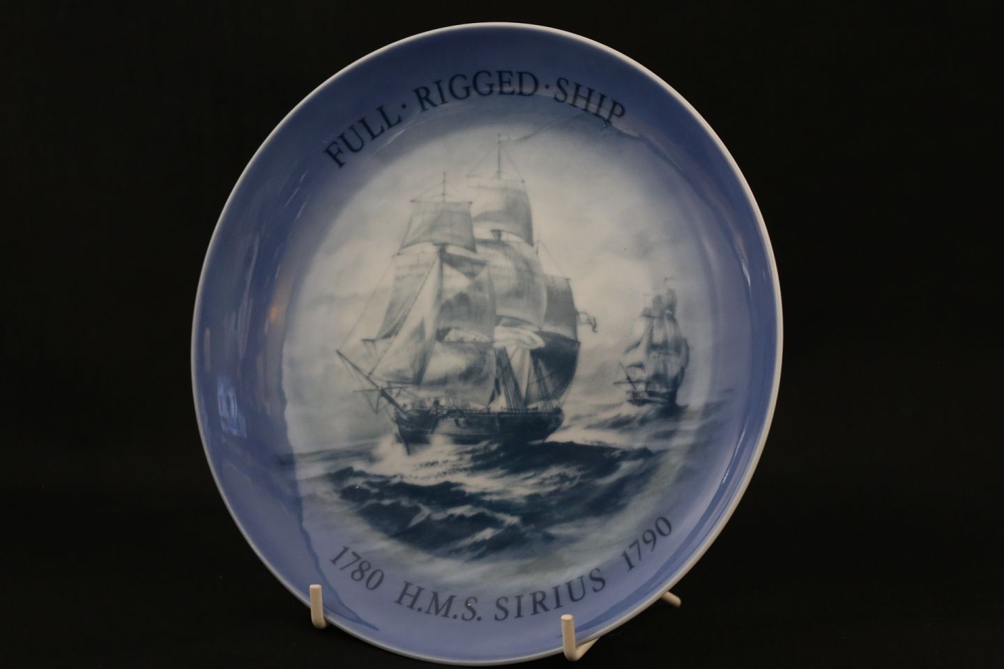 Skibsplatte Bing & Grøndal, No. 10, fra 1988. Platten er bemalet med Full Rigged Ship, med teksten 1780 H.M.S.Sirius 1790 Der er tekst om skibet på bagsiden af platten.