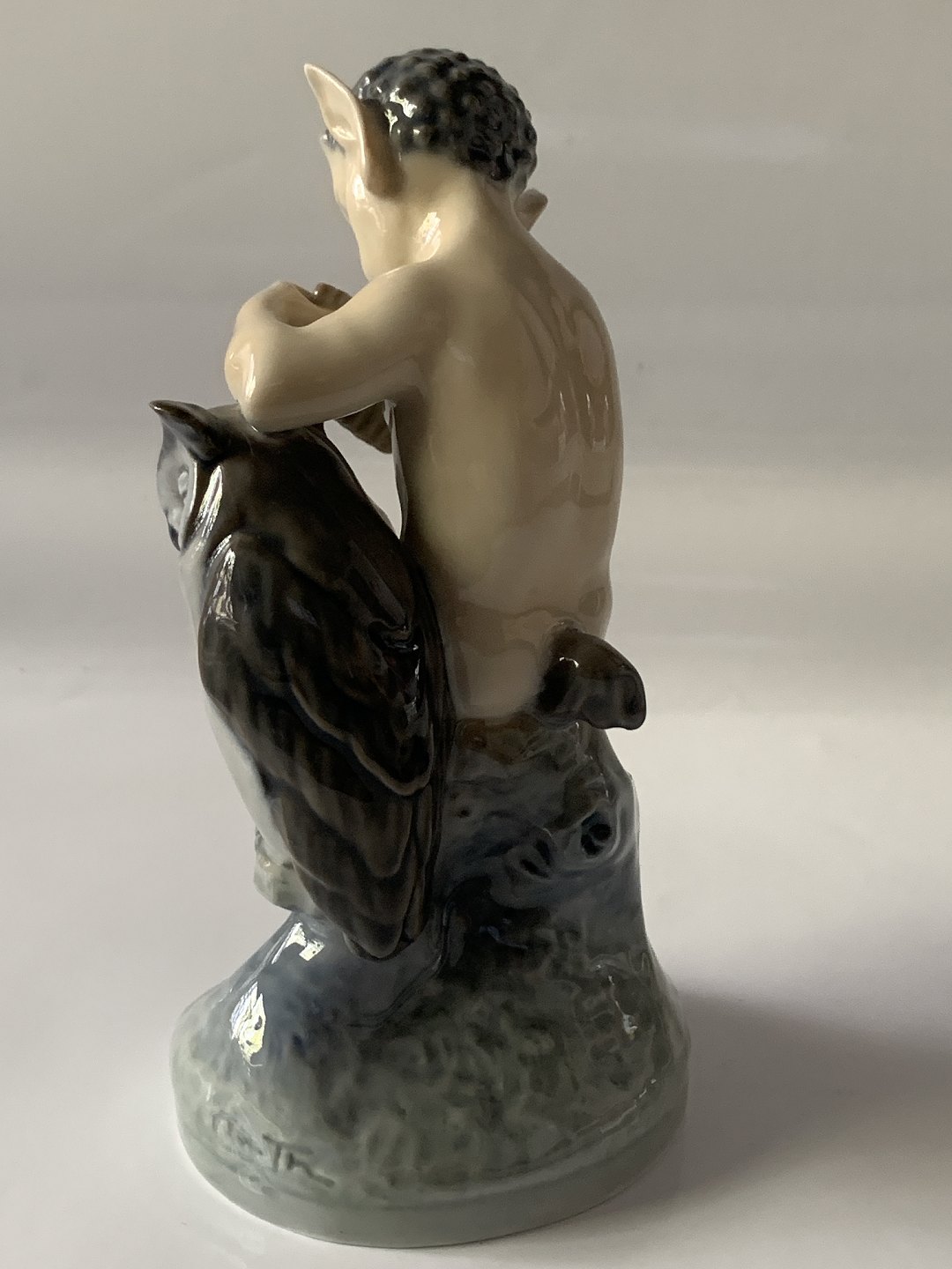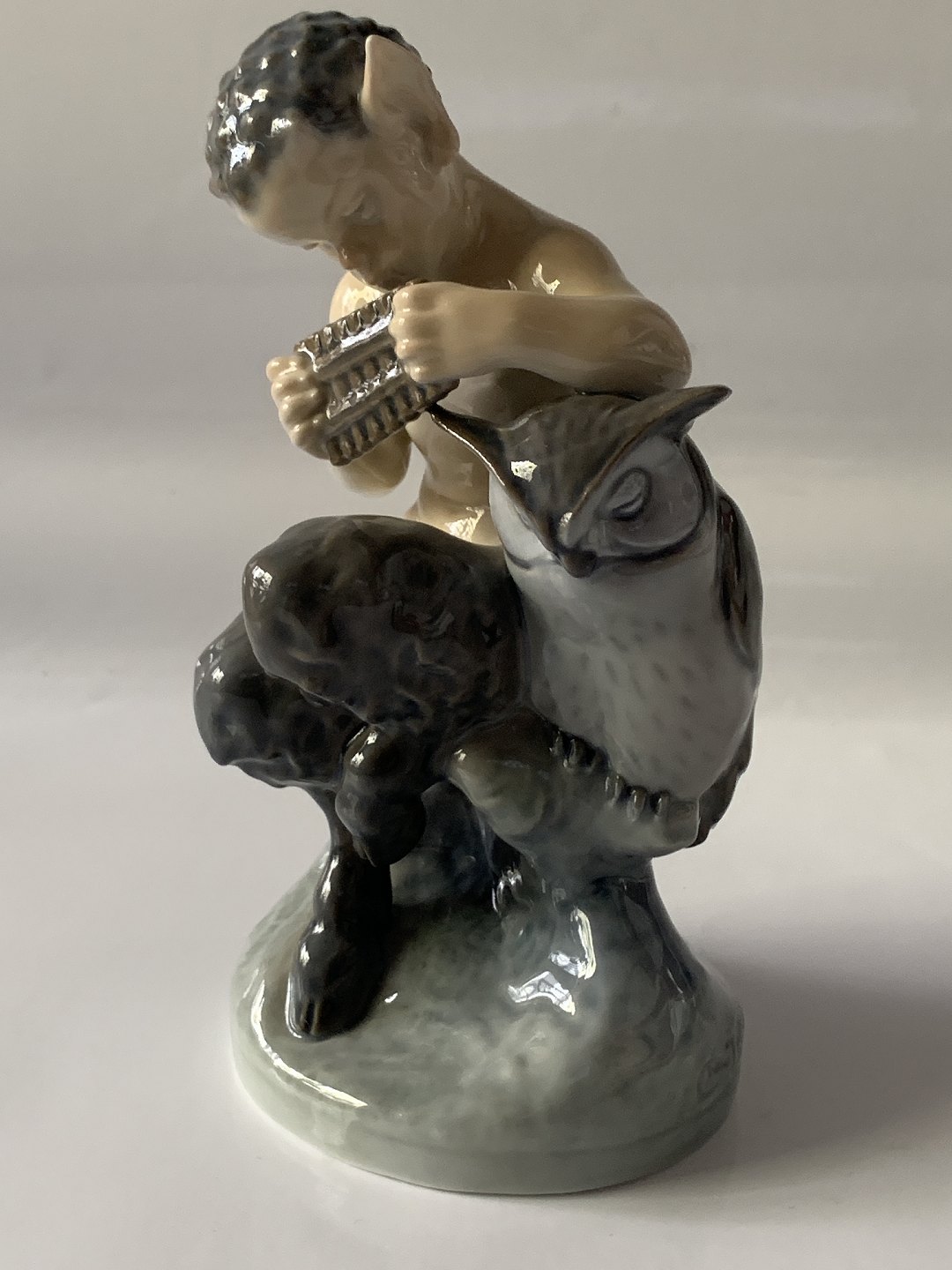 Beautiful little figure depicting Faun with owl. The figure is from Royal Copenhagen, 1st assortment and is made with beautiful colors and details. Figures from Royal Copenhagen are beautiful decorative objects that can be part of collections, or decorate a bookcase or windowsill. With a height of 16 centimeters, it is a nice little figure that will look great in any home.
