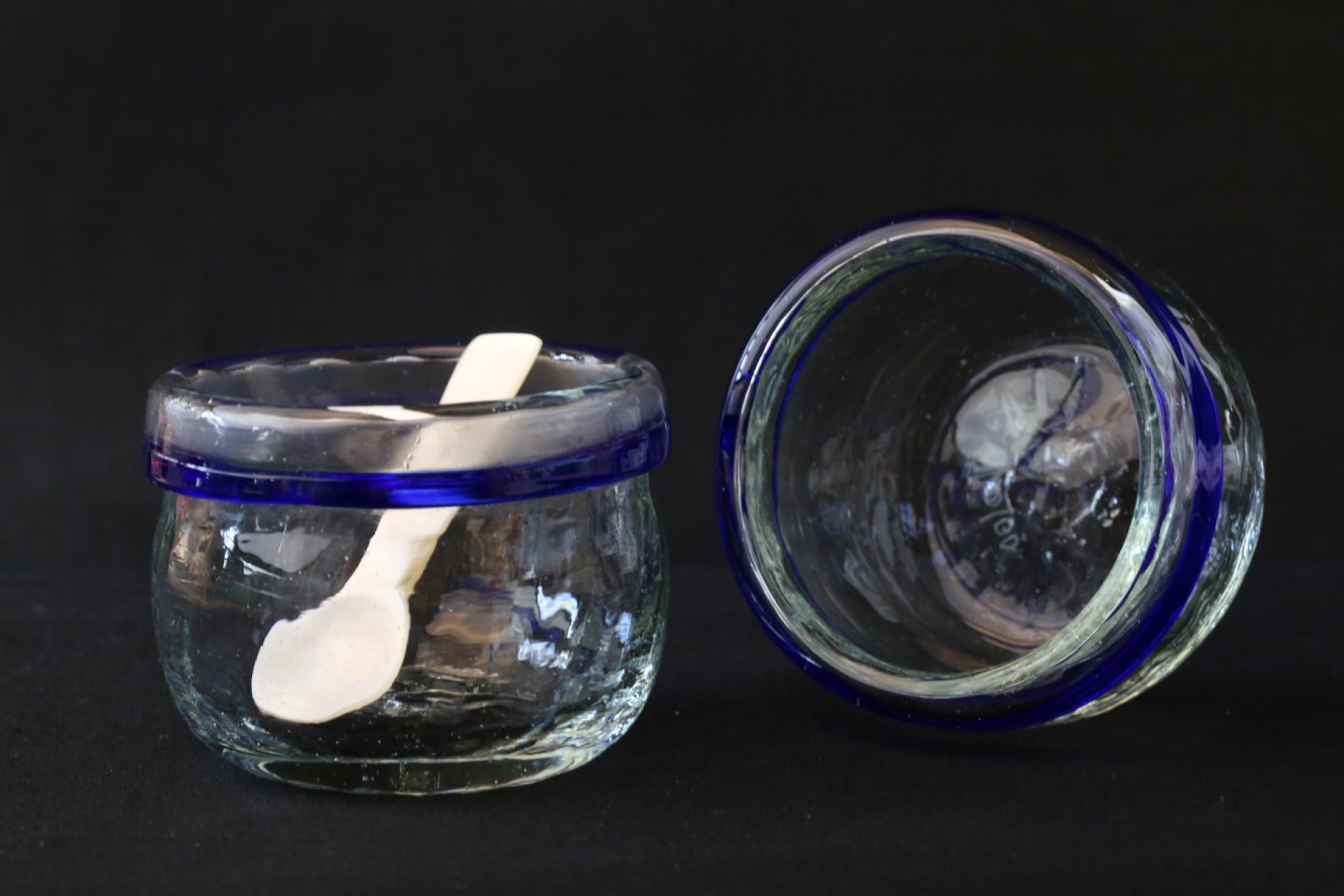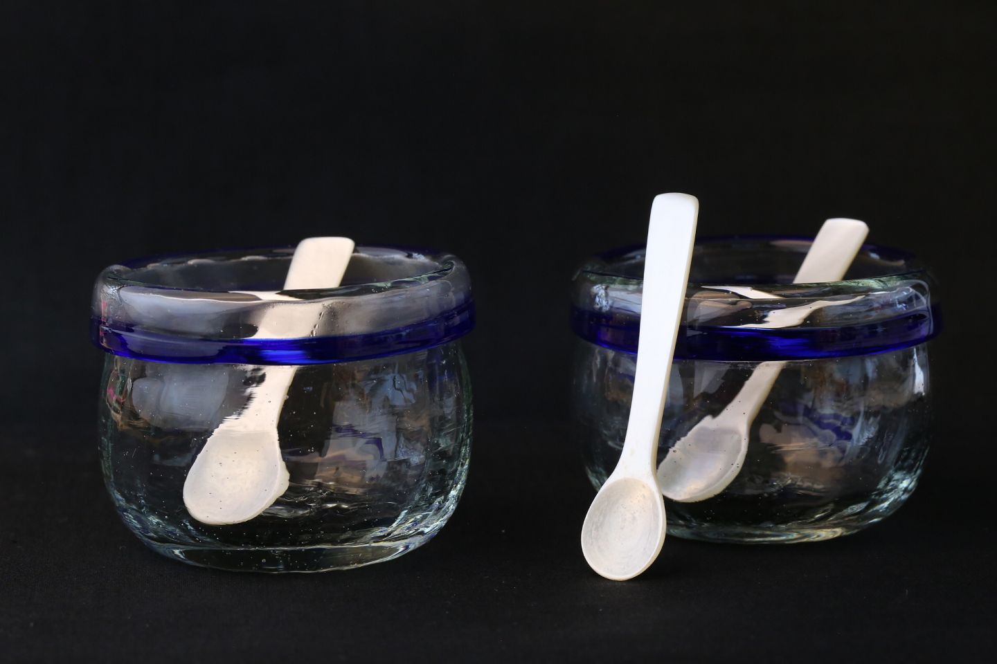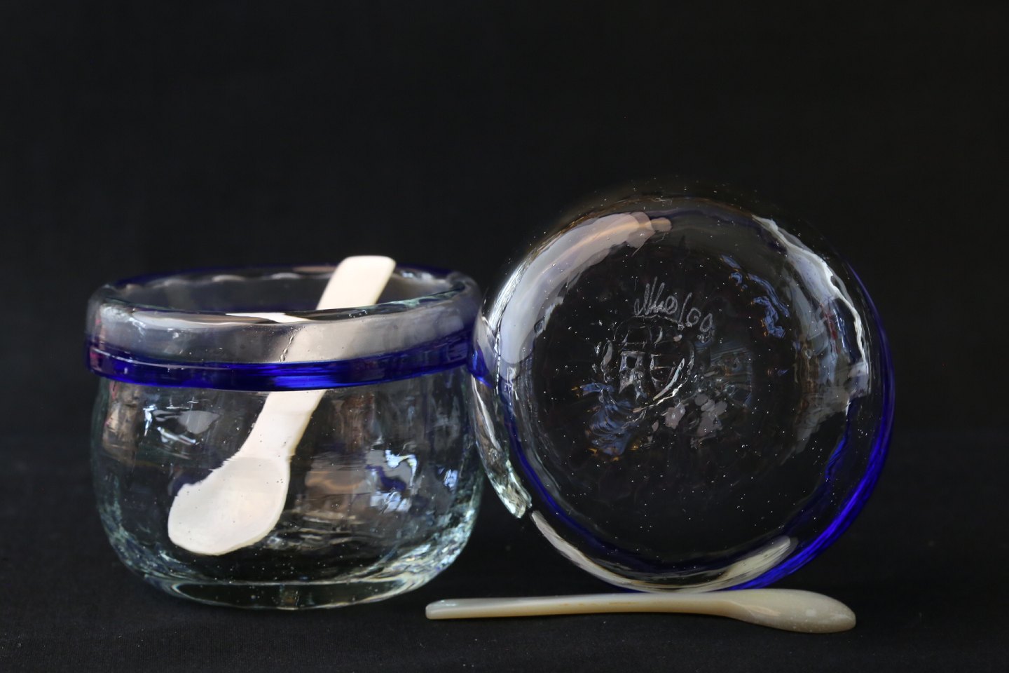 These two decorative glass bowls look great on any dinner and kitchen table. The glass bowls have a nice blue band at the top, and the beautiful little mother-of-pearl spoons go perfectly with these bowls.