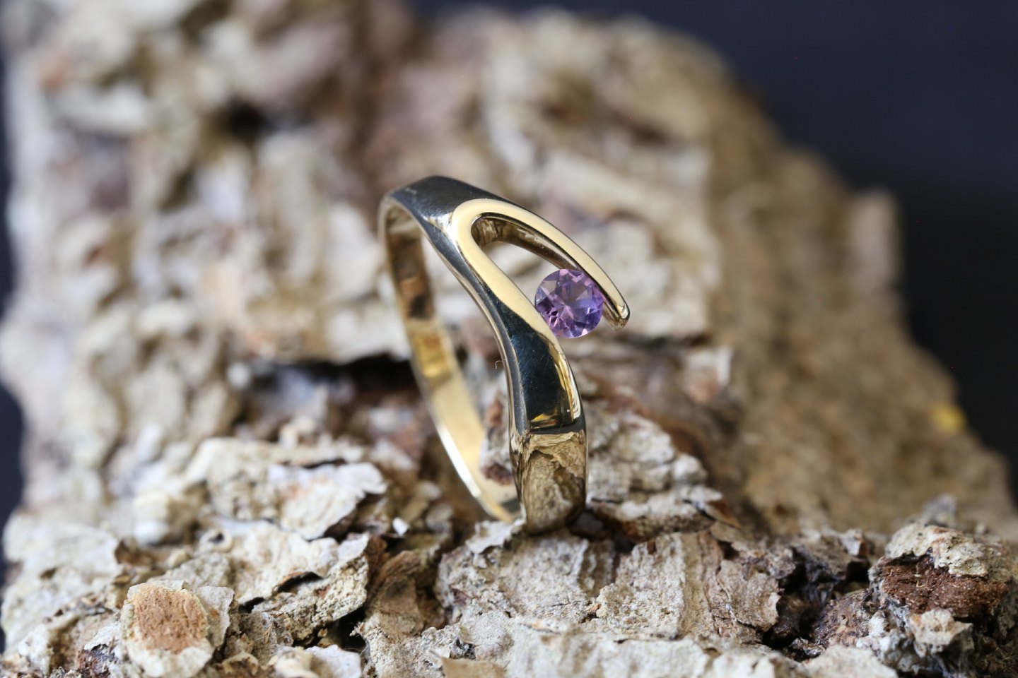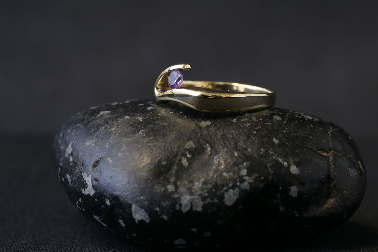 Women's ring in 8 carat gold. The unique and beautiful design gives the hand a very exclusive look. The ring is forged with attention to detail and the unique look. The soft lines and the inlaid purple amethyst make this ring something very special.
