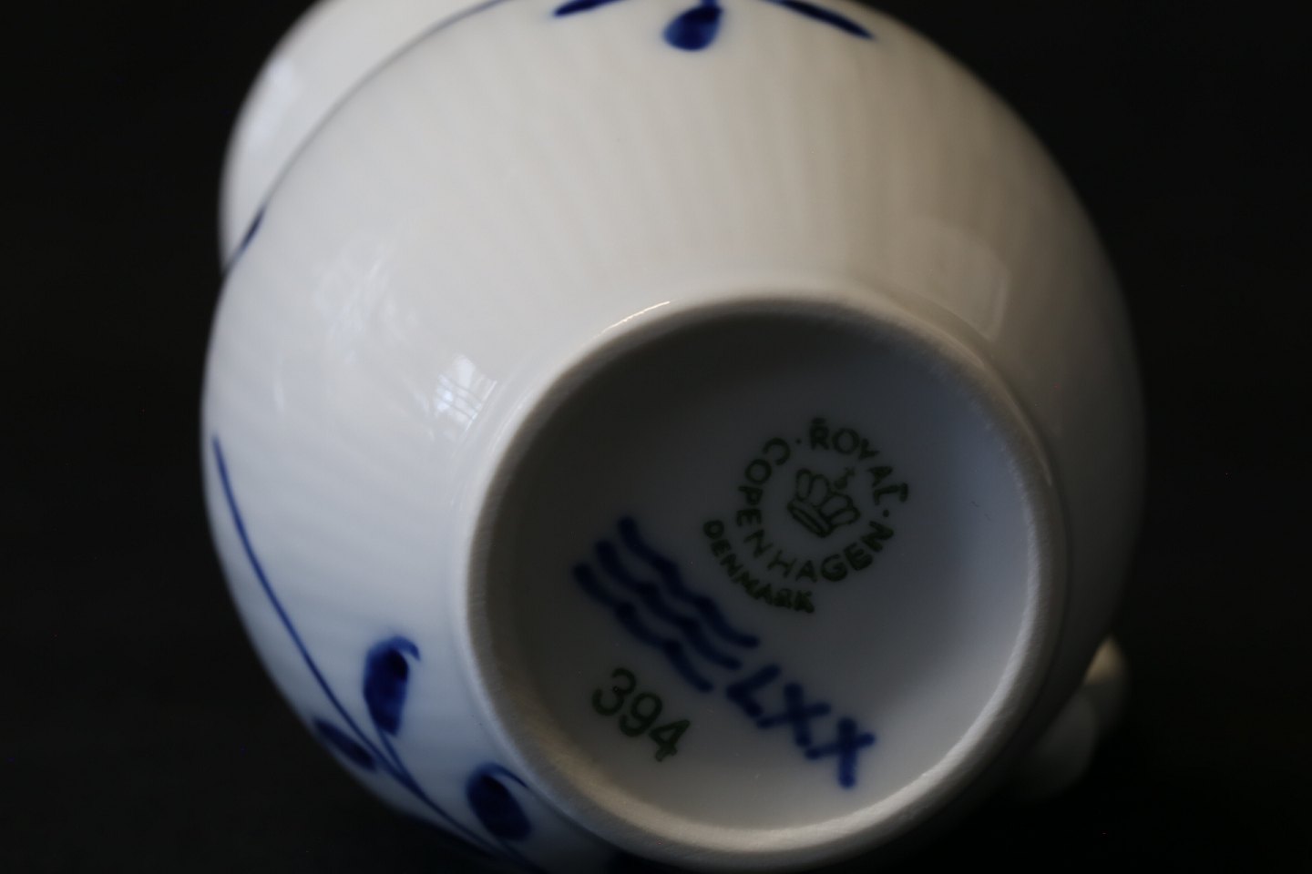 Blue mussel painted cream jug, discontinued model. Dec. No. 394, 1st black.