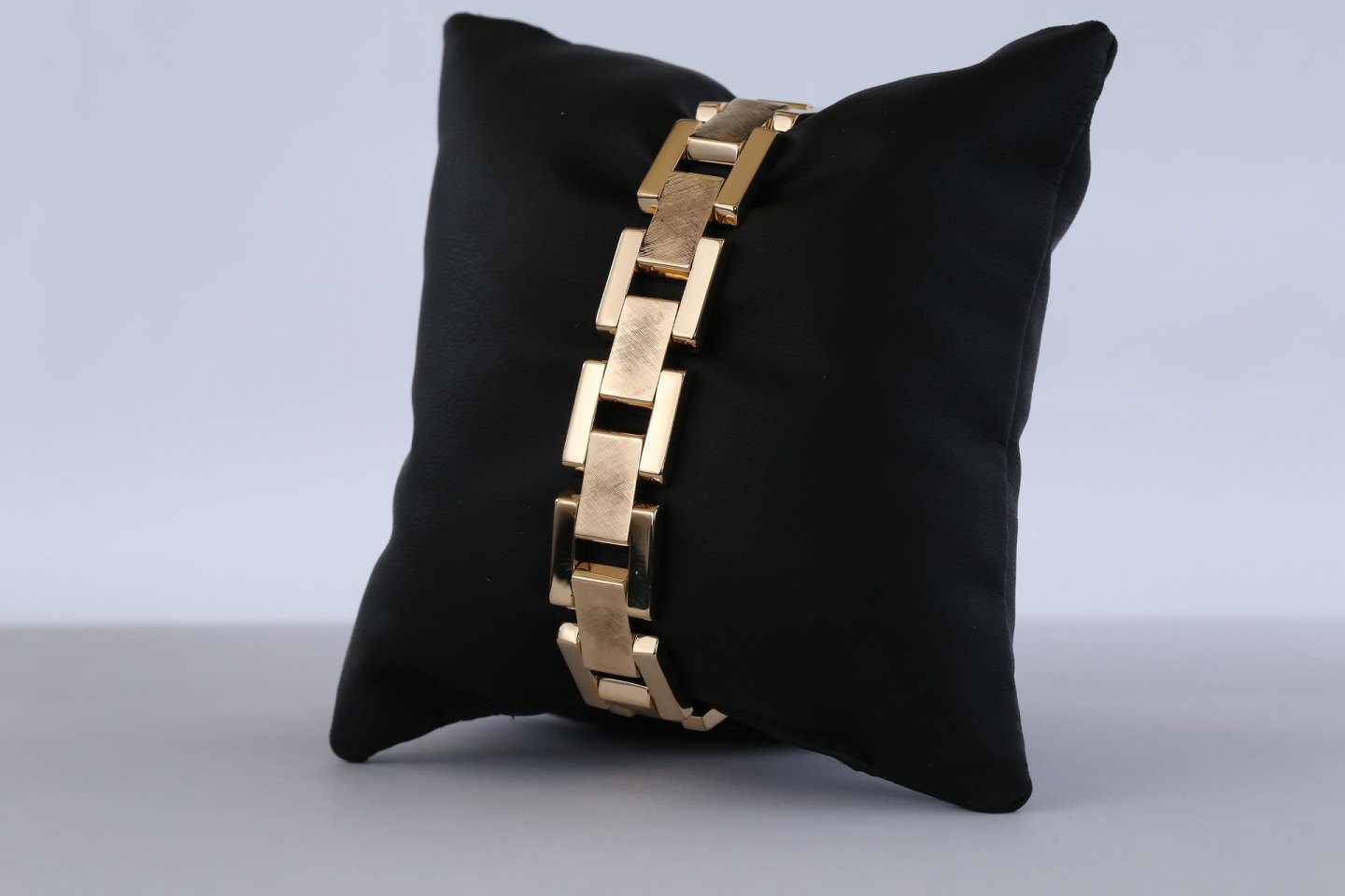 This classic bracelet in Blok design is special because it has chiselling on the joints. This is not often seen, which is why this bracelet is something special. The massive links of 14 carat gold are set in 3 rows, which give the bracelet the typical look seen with Blok bracelets.