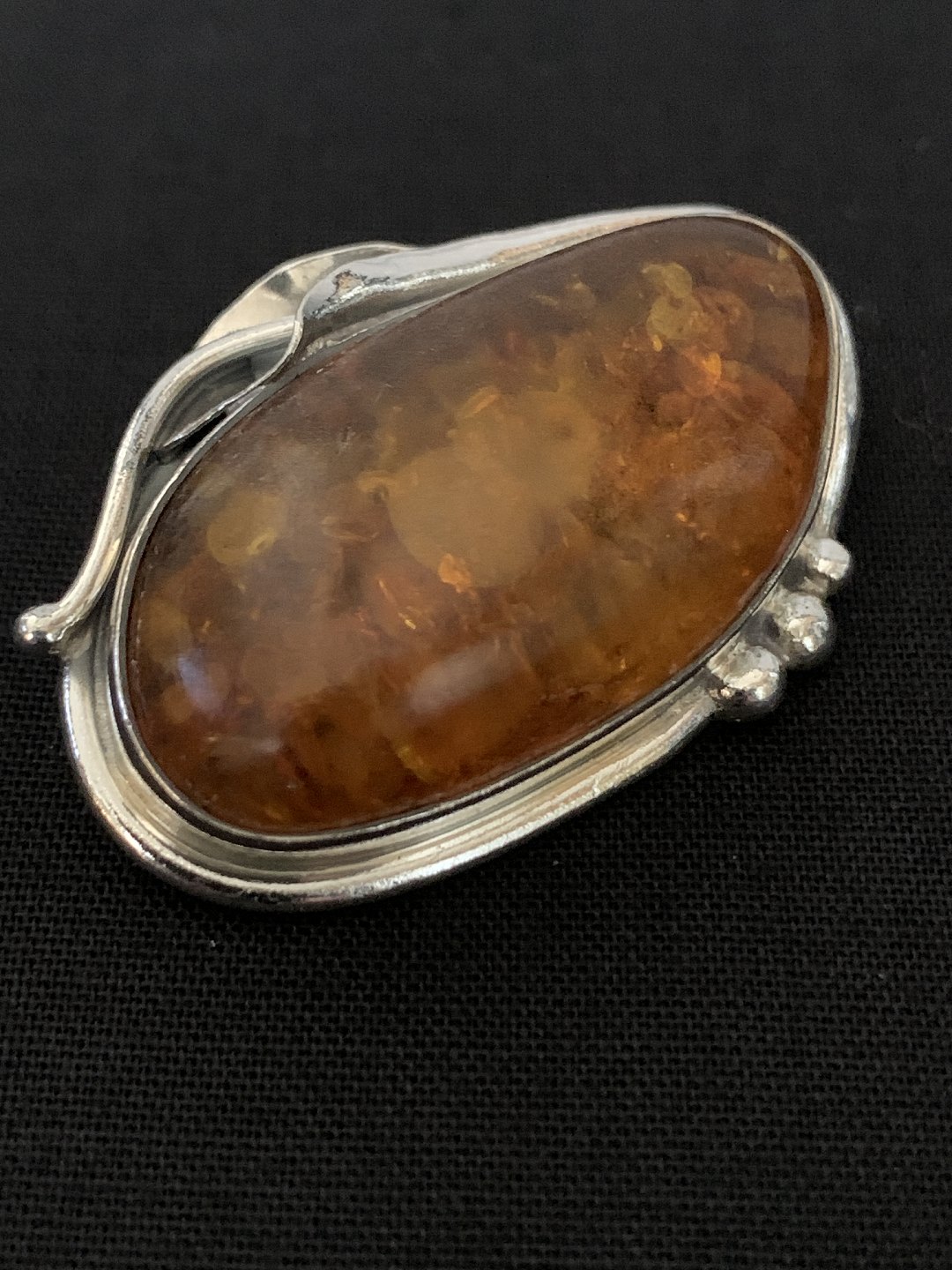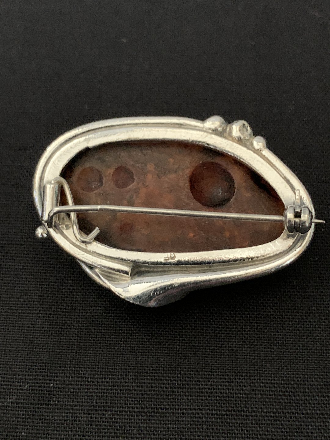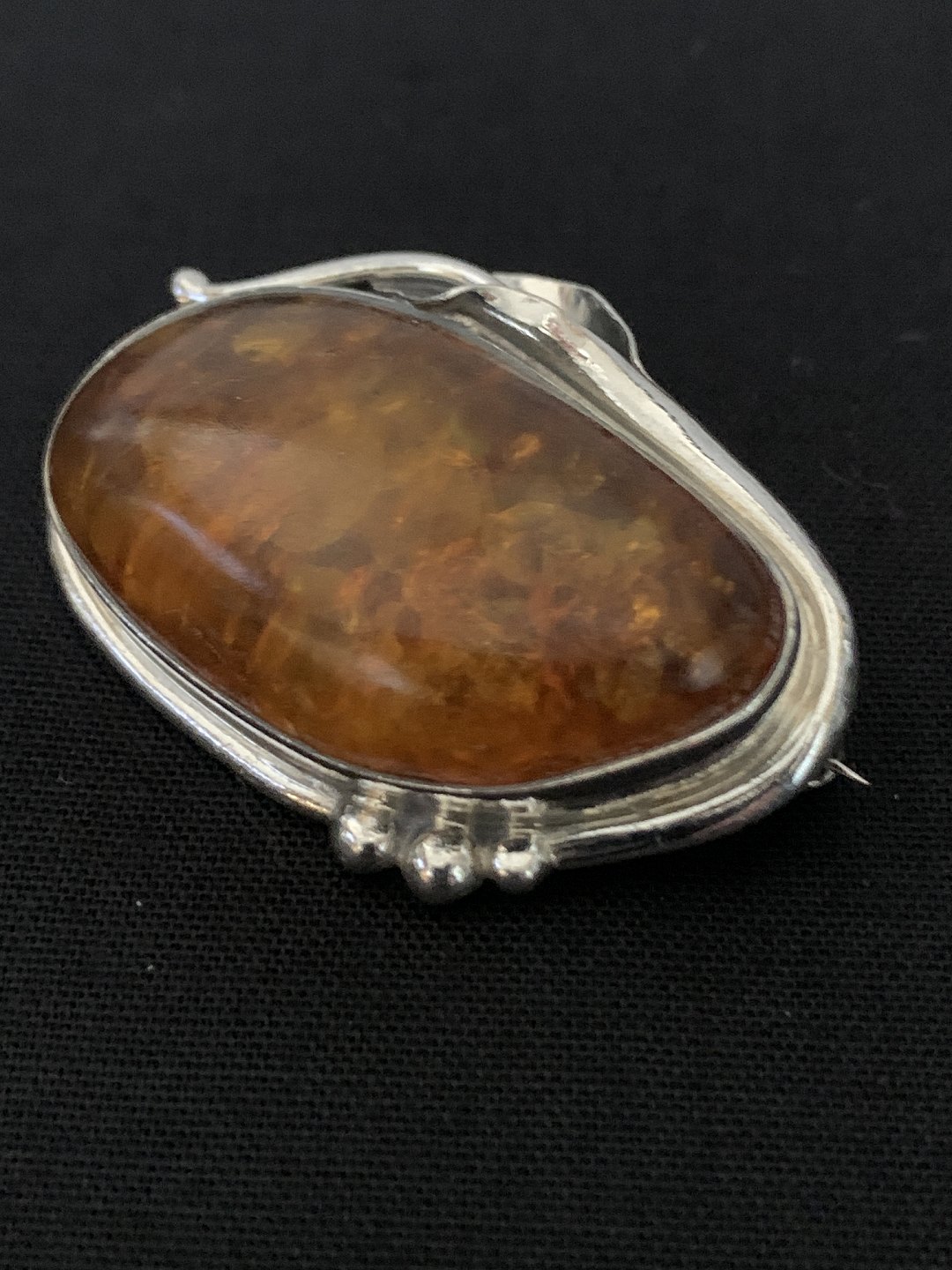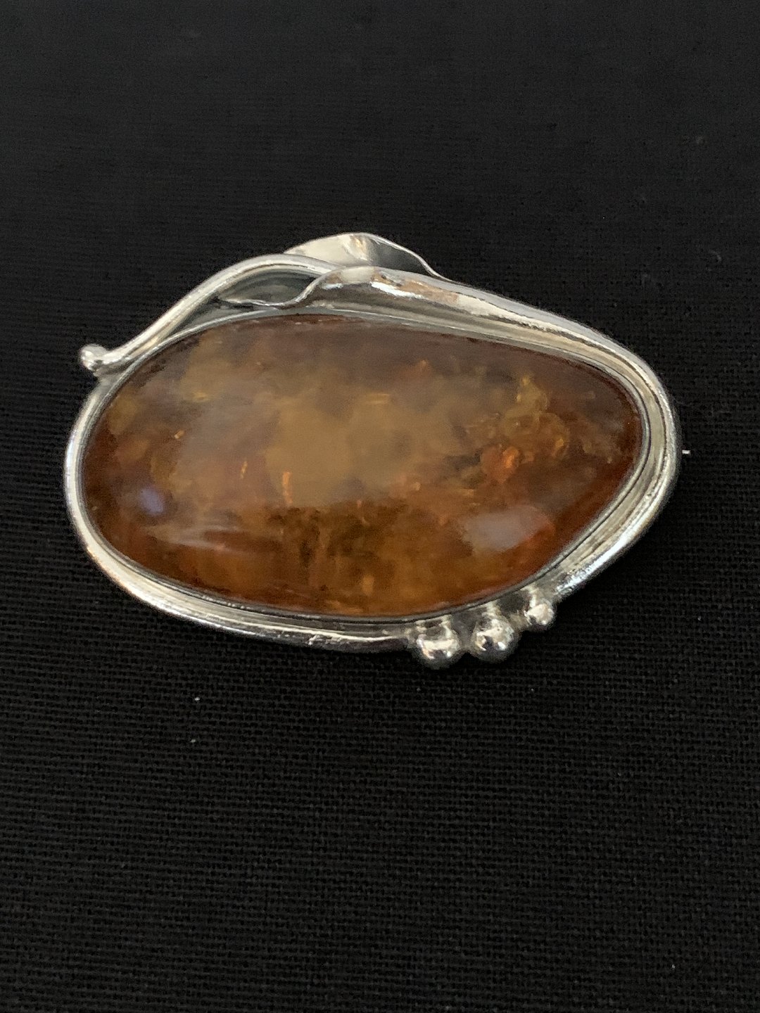 Brooch in sterling silver with amber Stamped SD 925S Measures 4.0 cm length Wide 2.7 cm See also our large selection of jewelery at the antique house here: https://www.antikhuset.net/katindex.asp?kukat=597