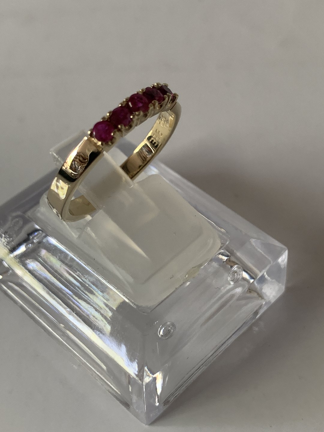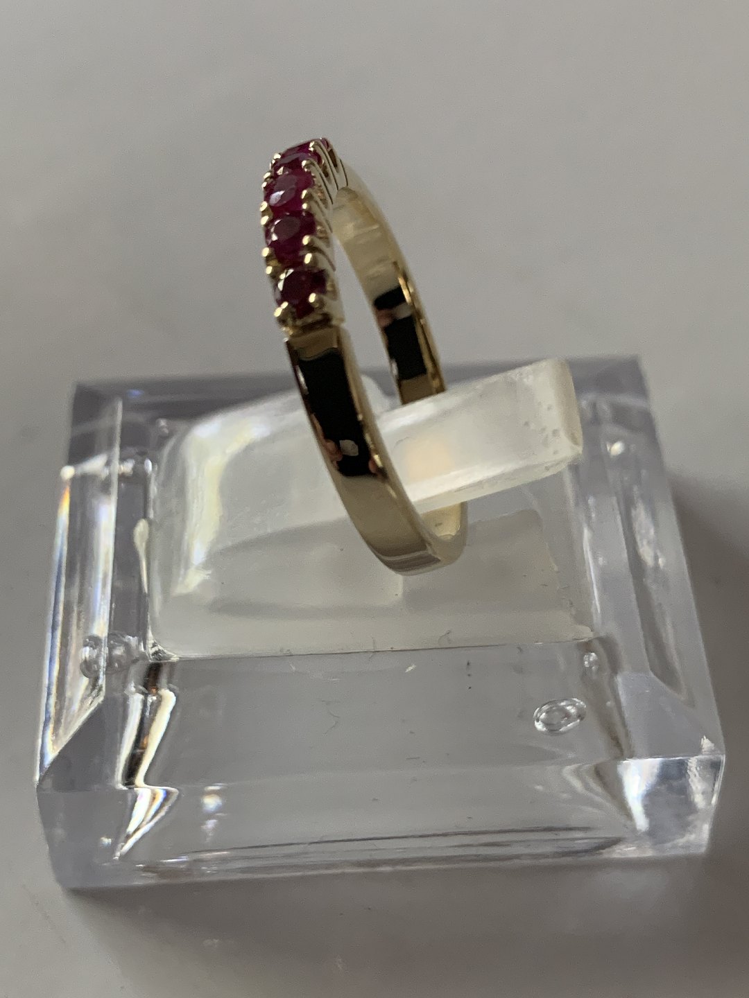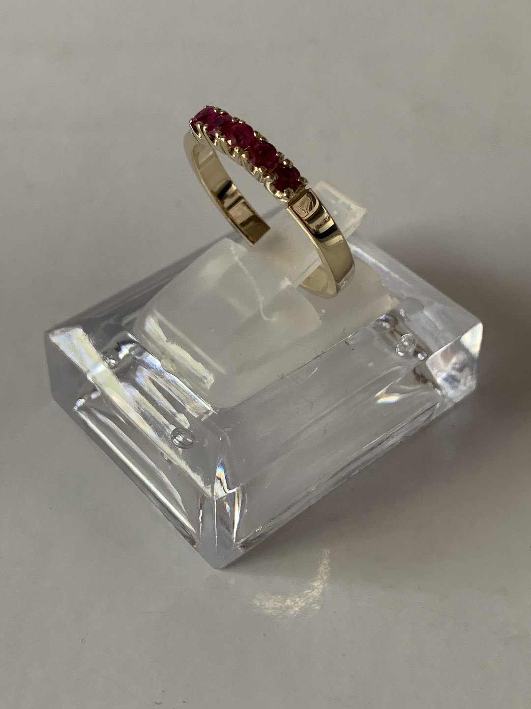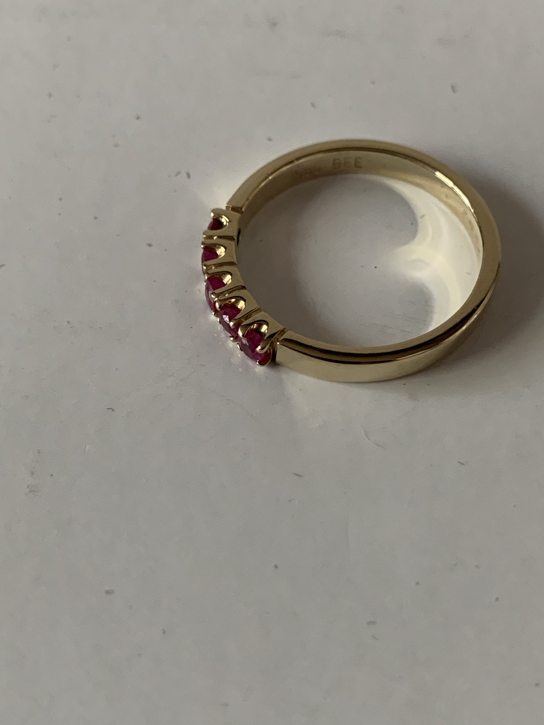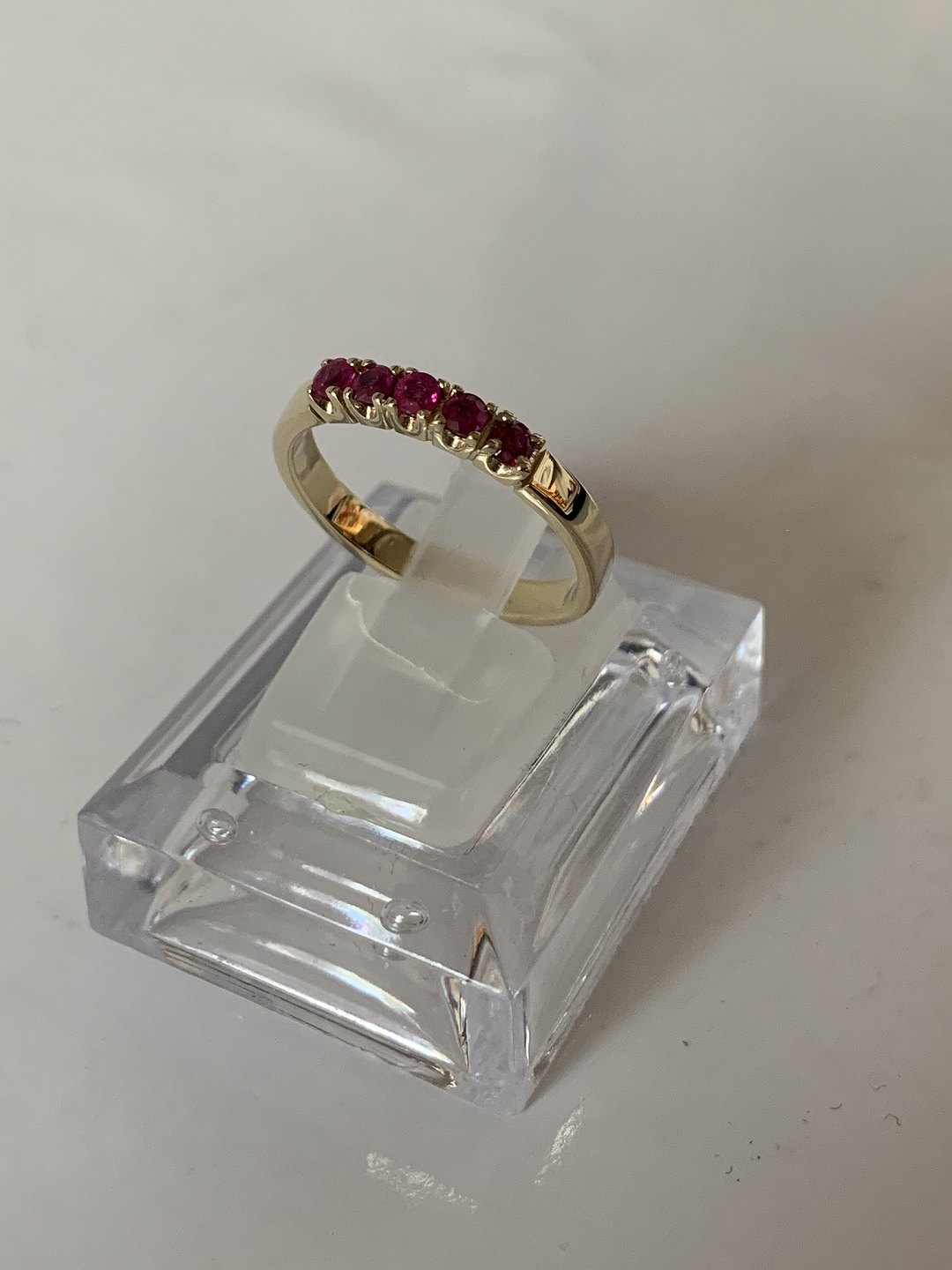 Beautiful gold ring with inlaid 5 red rubies, simple structure but still very nice ring. This ring can be worn either alone or in combination with other rings.