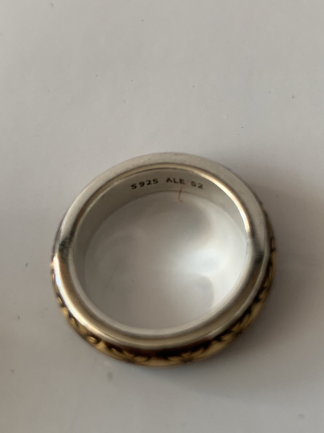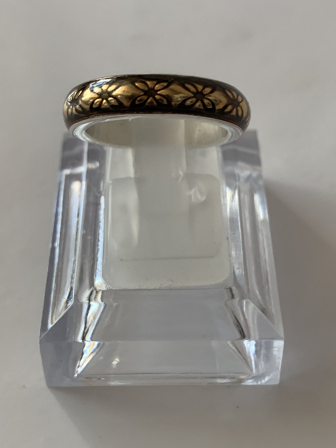 Der er flot kontrast mellem det gyldne mønster og ringens sølvfarvede metal. Alt i alt en meget elegant ring.