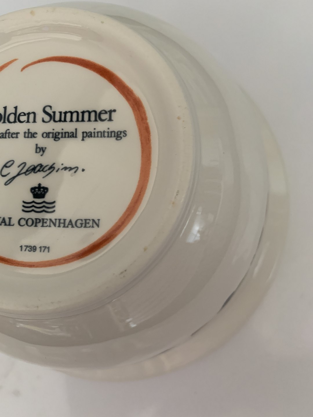 Royal Copenhagen Golden Summer, Round bowl 1. Sorting Diameter 16.5 cm. Height 8.3 cm Decoration number 1739 171 See our large selection of Dining / Coffee sets at Antikhuset here: https://www.antikhuset.net/katindex.asp?kukat=553