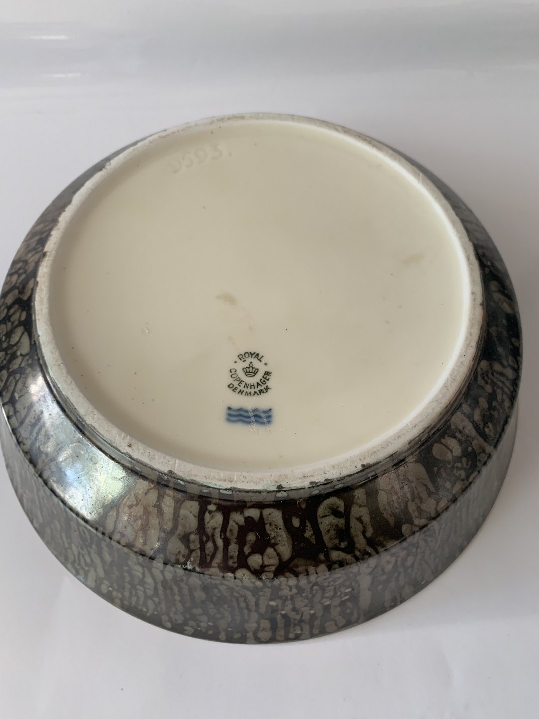 Flot porcelænsskål fra Royal Copenhagen med guldkant og flot motiv i bunden. Skålen er malet i tidløst mønster og farver, der gør at skålen kan bruges til nærmest alle formål. Det er en skål der kan stå fremme som dekoration, eller bruges til opbevaring.