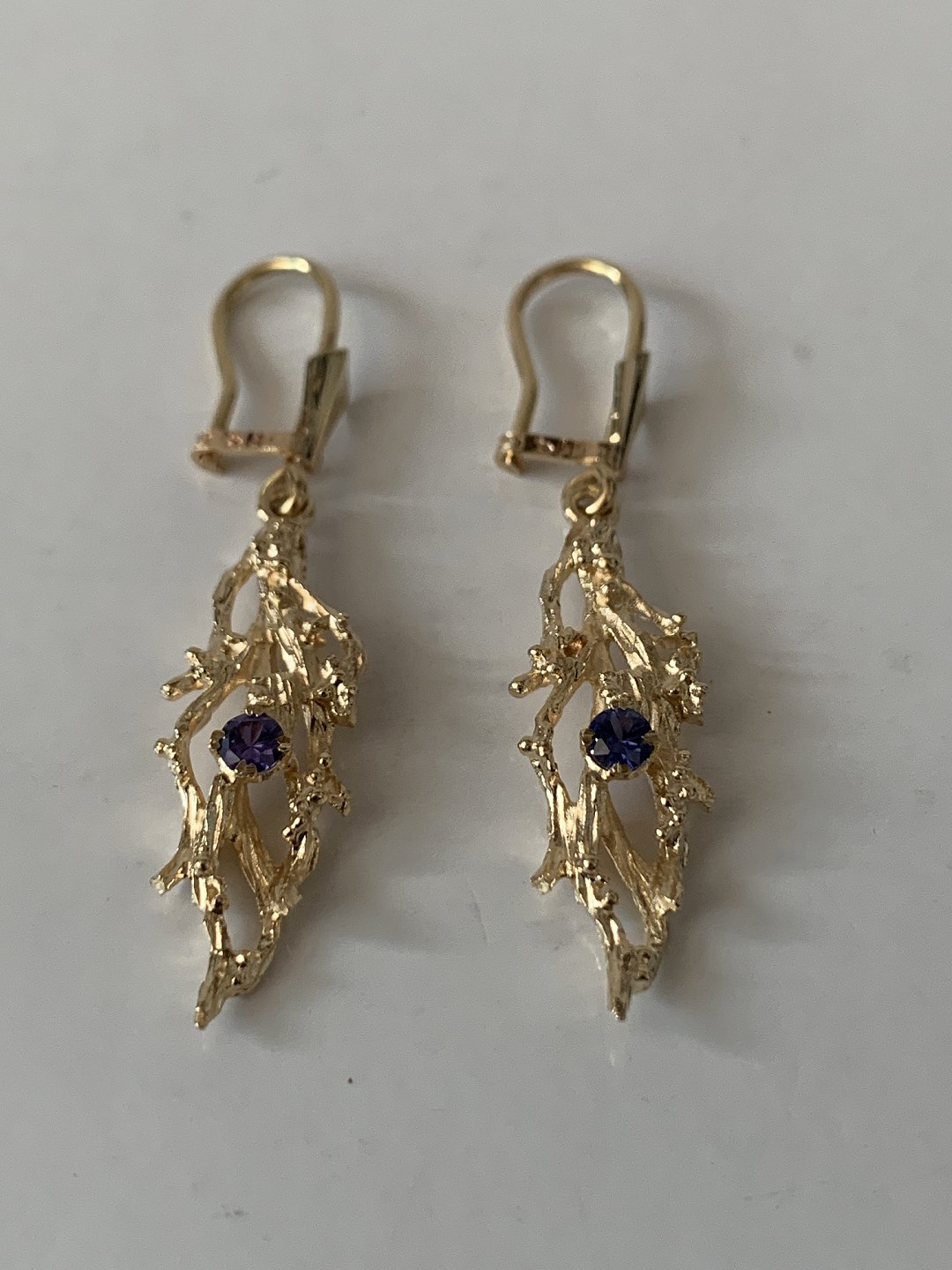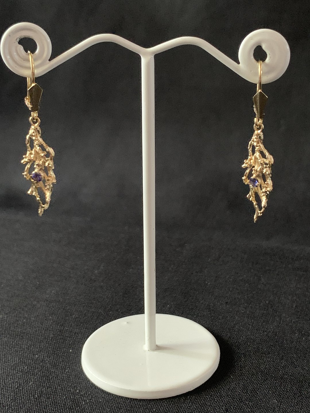 Gold earrings in 14 carat gold, with purple stones and stamped 585 HS