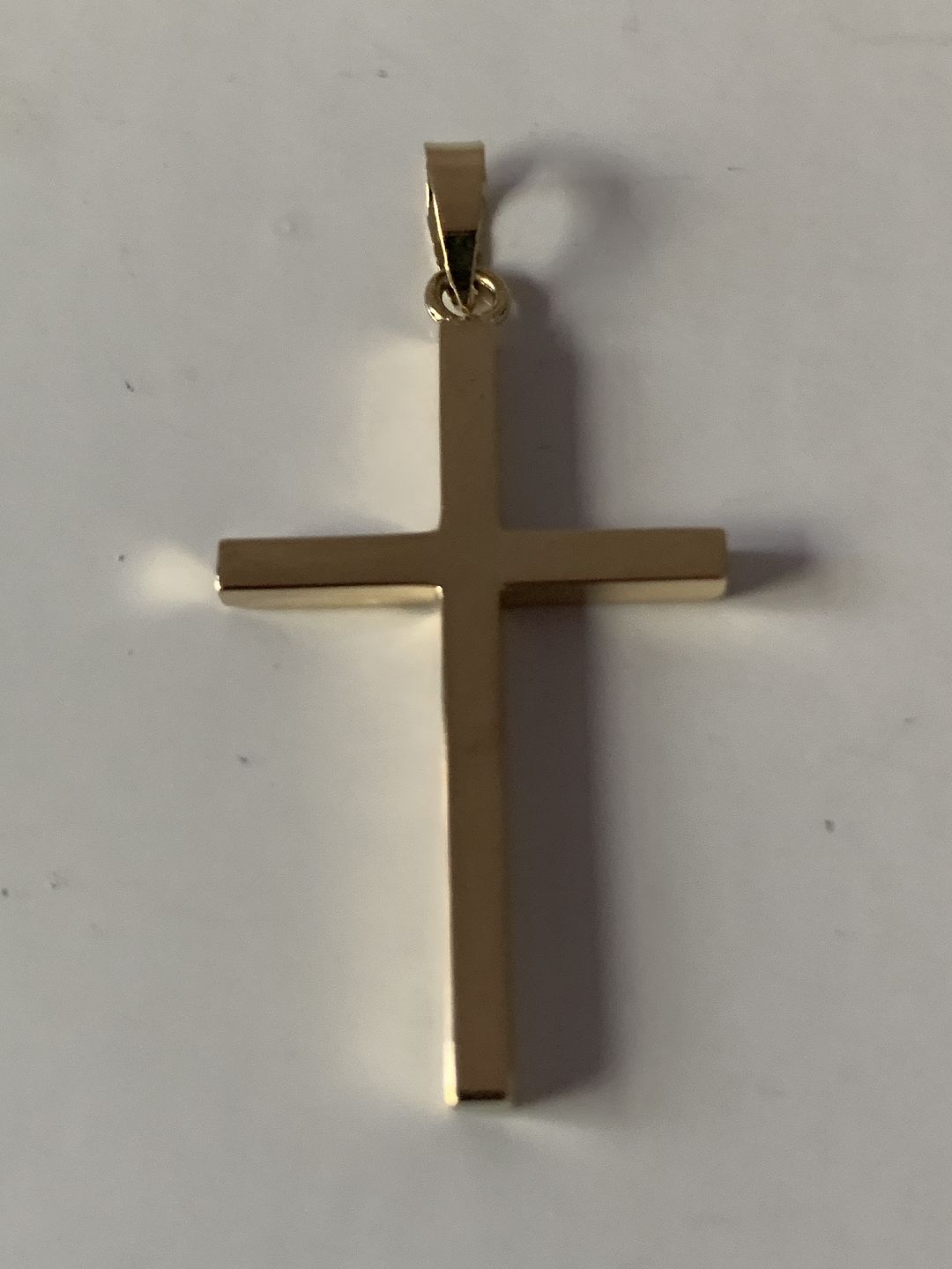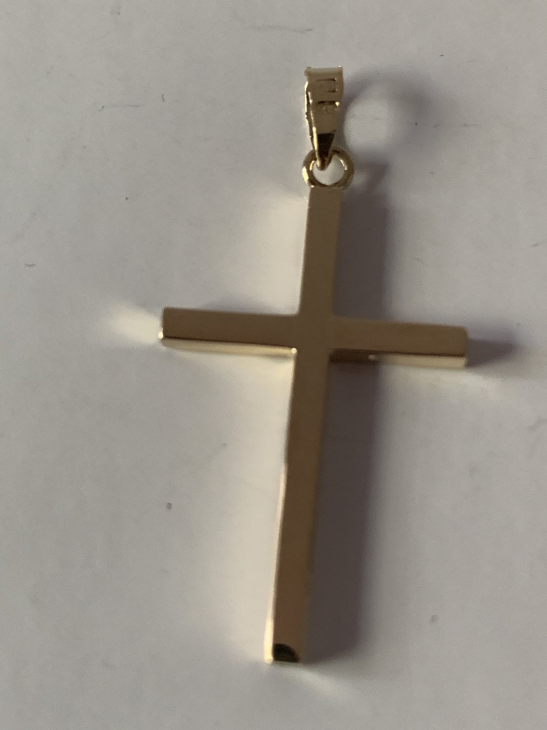 Simple and elegant gold cross for necklace, in 14 carat gold. The cross is made in a simple style that will suit a thin gold chain. The gold cross is a traditional piece of jewelery that can be worn by both women and men as everyday jewellery.
