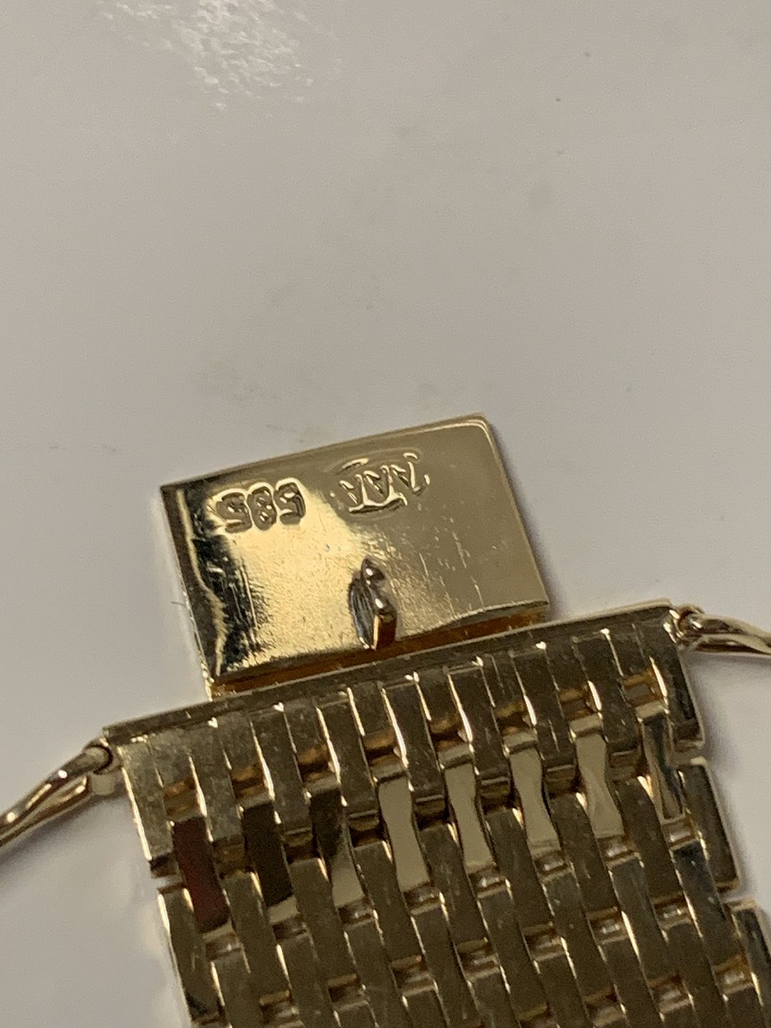 Mursten Armbånd 17 Rækker 14 Karat Guld Stemplet: 585, AAA Bredde 17,26 mm. Længde 18,5 cm. Tykkelse 1,37 mm. Smykket efterset af en guldsmed Varen findes ikke fysisk i butikken, kontakt os for fremvisning