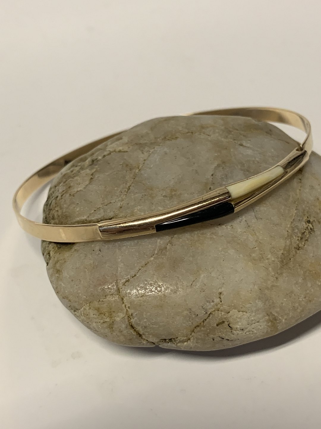 Bracelet in 14 carat gold with white/black stone. The oval bangle is opened/closed by the mortise lock on the side.