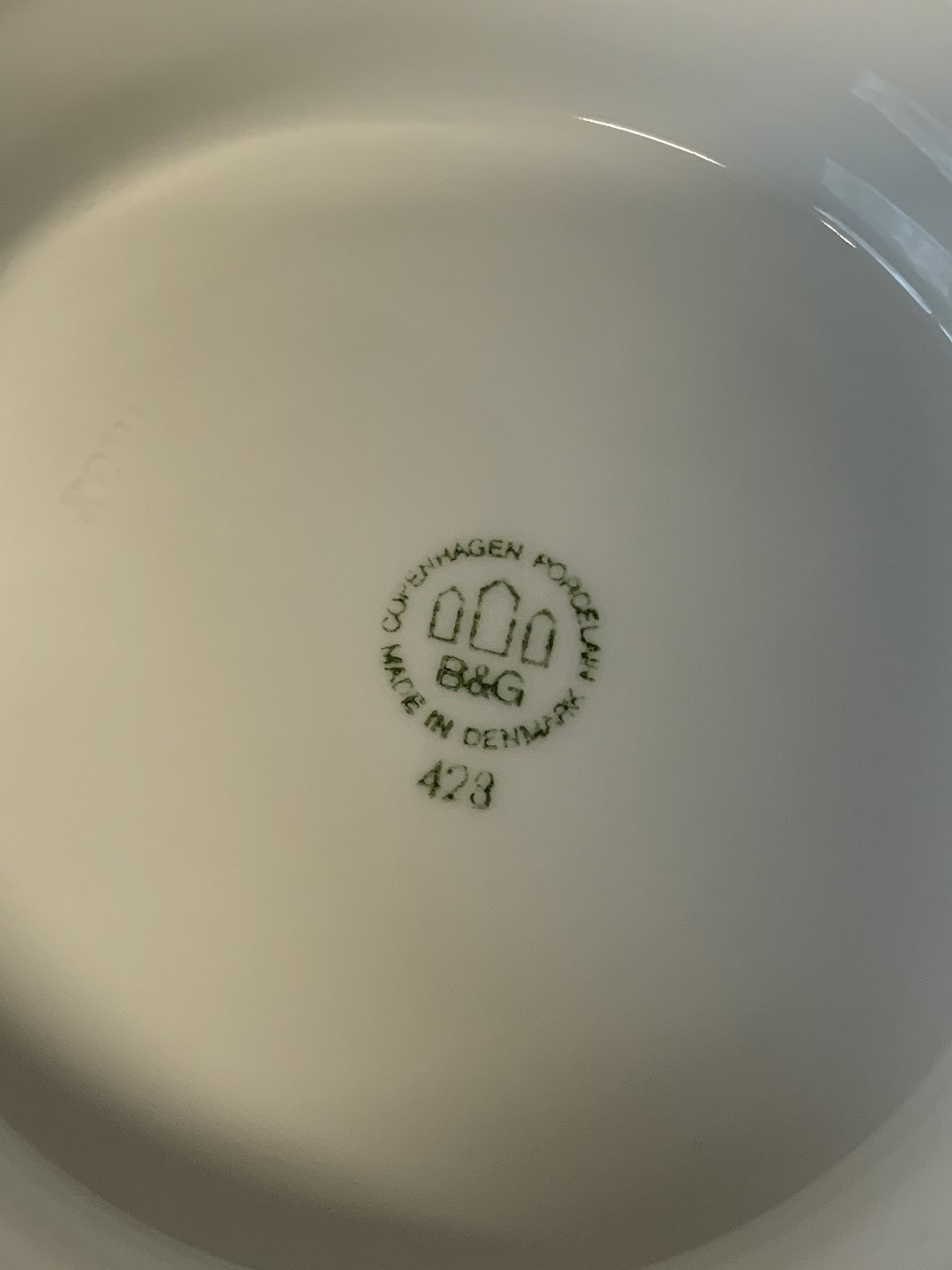 Bing & Grøndahl Mussel painted "Blue painted", set on a low stand.