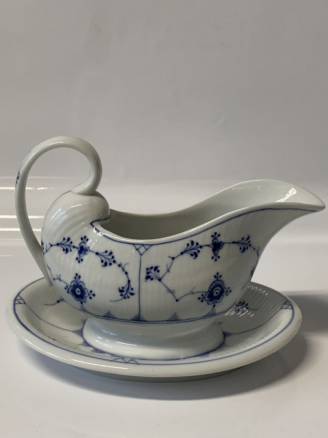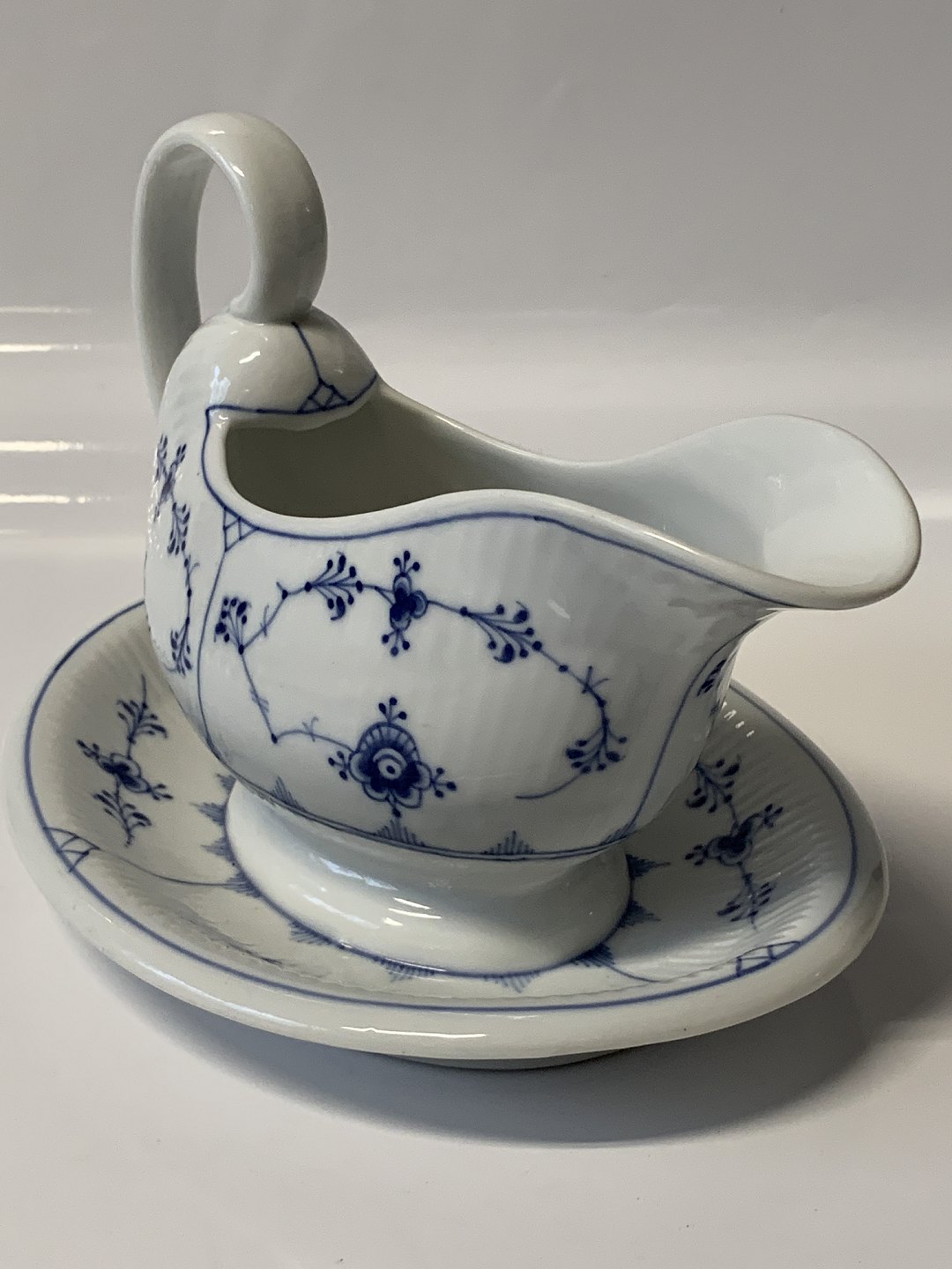 Royal Copenhagen Musselmalet Fluted rare sauce bowl on fixed saucer and with handle.