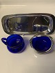 Small sugar bowl and creamer in blue glass, with a silver stained tray. The sugar bowl with a handle of silver stain, which is stamped. A beautiful set that will suit both the breakfast and coffee table.