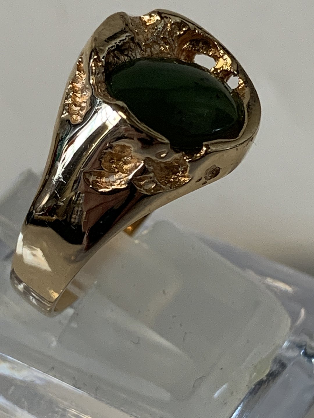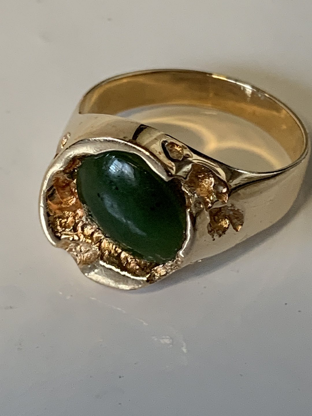Flot og damering med helt unikt design. Ringen er smedet med mange flotte detaljer. Selve jaden er nedsænket i guldet, hvilket giver en utrolig flot 3-D effekt, som en sø i et landskab. Samtidig er ringen lavet i massivt guld, hvilket giver ringen styrke.