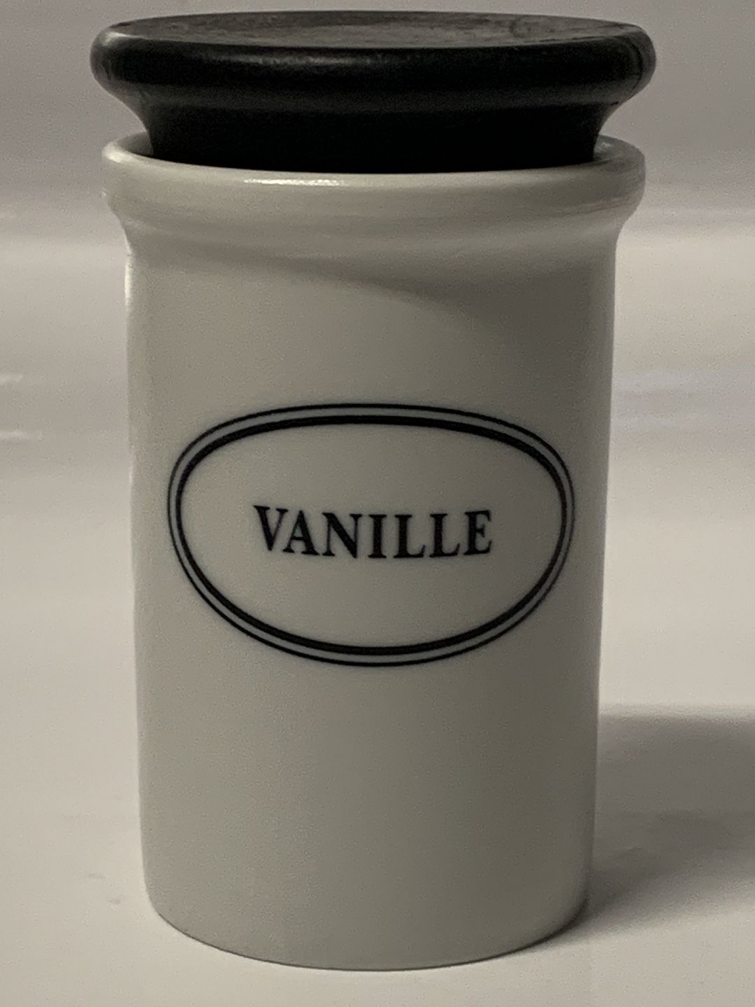 Eslau, Vanille krydderikrukke designet af Bjarne Bo. Matglaseret med sort trælåg, passer til Gourmetserien.