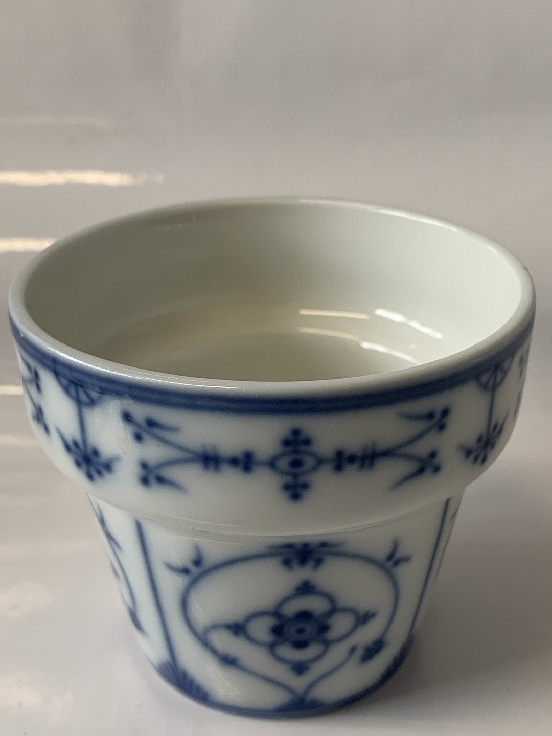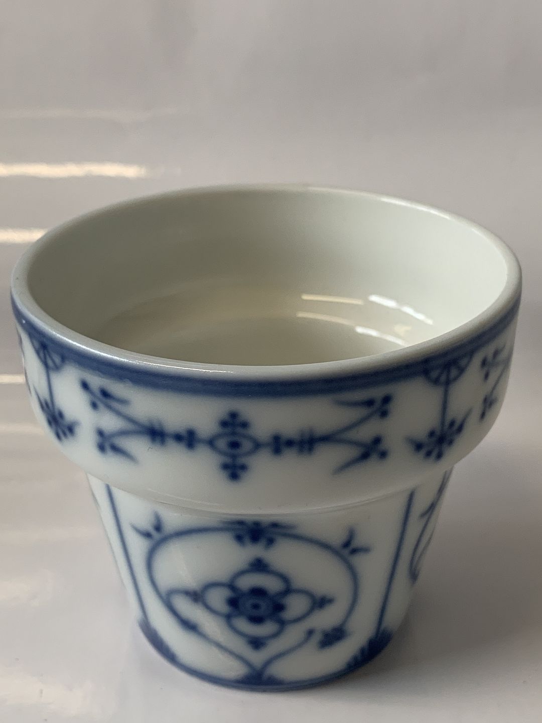 Urtepotte Musselmalet Tysk 1. sortering. Højde 6,2 cm. Diameter 7,3 cm. Dekorationsnummer 24. Fabriksmærket Bavaria. Perfekt stand uden fejl
