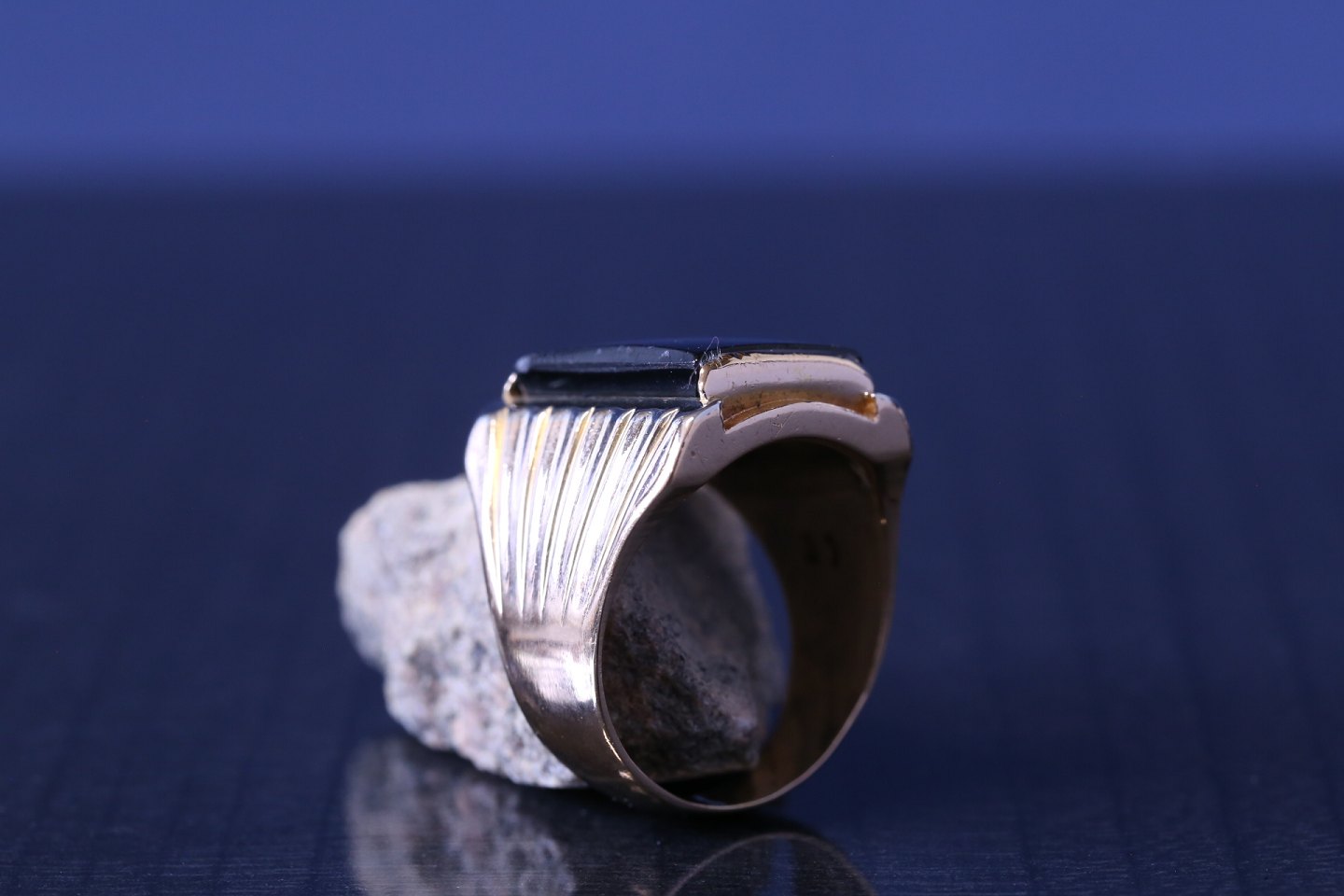 Beautiful men's ring in 18 carat gold, with beautiful black onyx. The design of the ring expresses strength and elegance. Therefore, this men's ring is a good choice for the mature man. The ring's beautiful large onyx gives dynamics and emphasizes the strength of the ring.