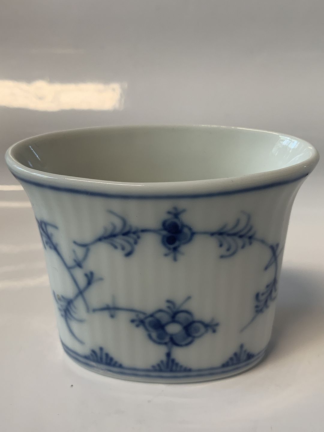 Royal Copenhagen Musselmalet Riflet Kuvertvase eller tandstikbæger Dekorationsnummer 2183. 2. sortering. Højde 6,5 cm. Produceret år 1947. Perfekt stand.