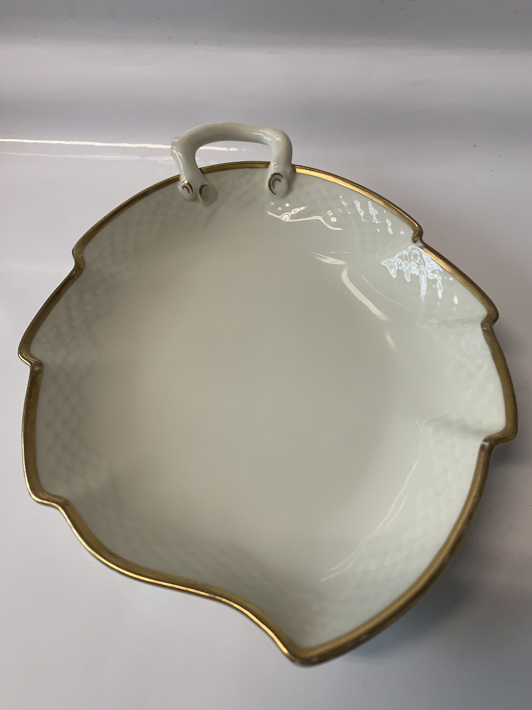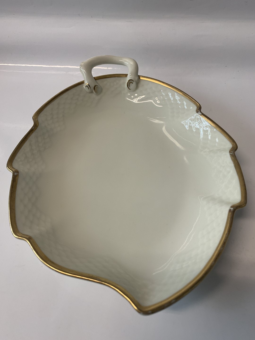 Åkjær Bing og Grøndahl, Bladformet fad. Dek.nr.: 199. Længde: 24,5 cm. Bredde: 18,5 cm. 1. Sortering. Lidt slidt på guldkanten ellers Pæn og velholdt