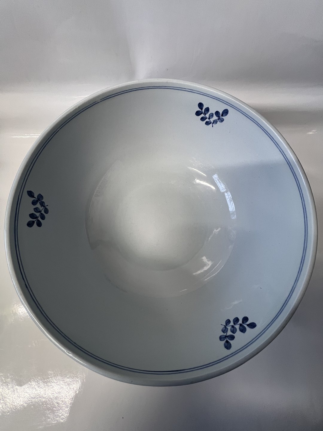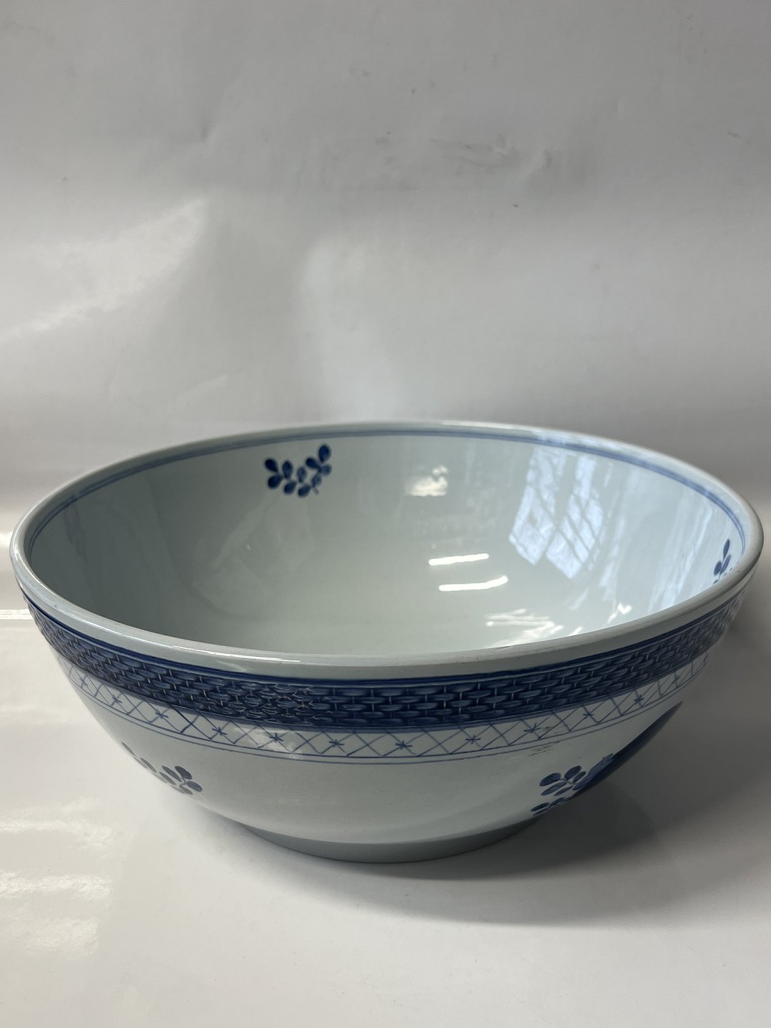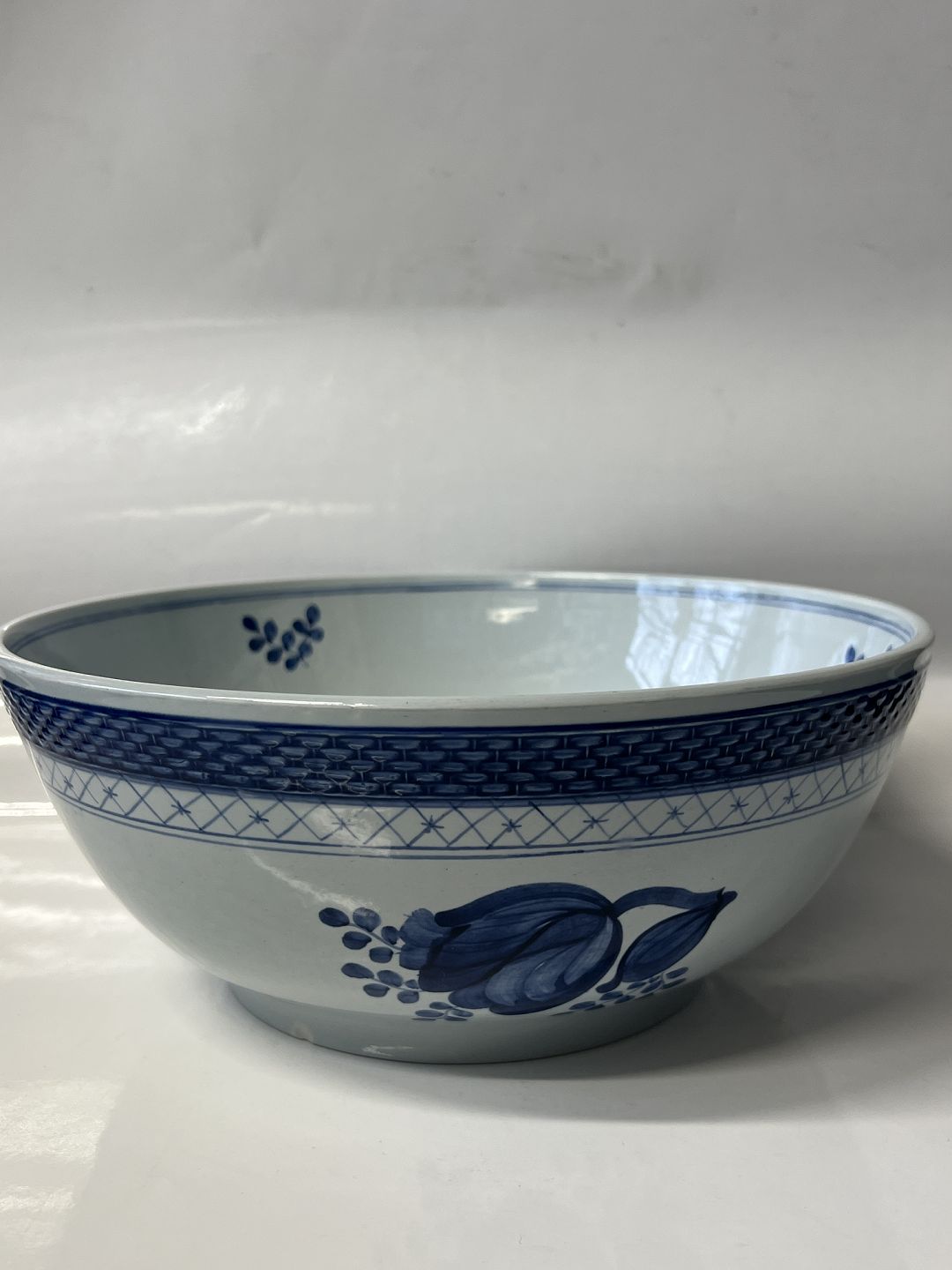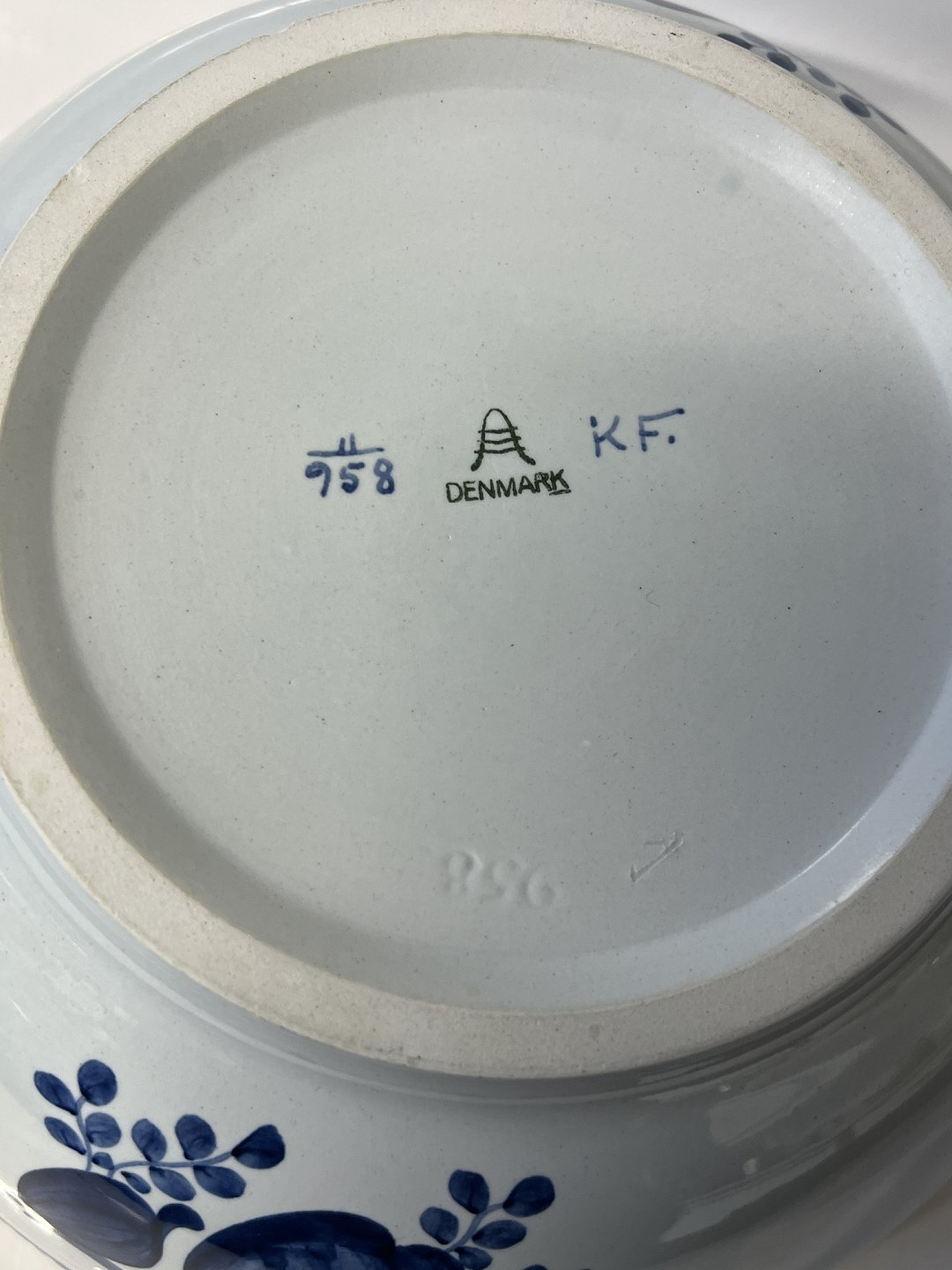 Royal Copenhagen Tranquebar, ekstra stor rund skål. Dekorationsnummer 11/958. Diameter 26,5 cm. 2. sortering. Der er et lille skår i bunden af skålen, se fotos Nr. 5, ellers fin stand.