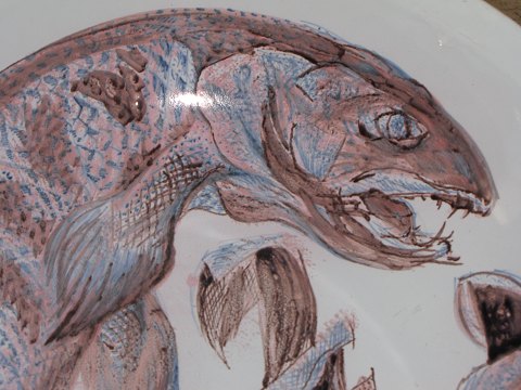 Aluminia keramik. Unika, KÆMPE skål med rovfisk af kunstner Thorkild Olsen. Diameter 50 cm., højde 12 cm. 1. sortering. Perfekt stand uden fejl.