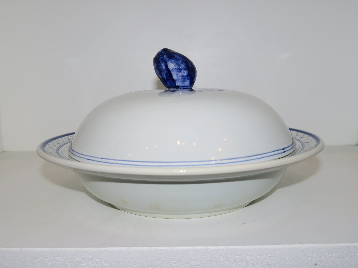 There are a few discolorstions and a small crack in glaze at edge, otherwise perfect condition.